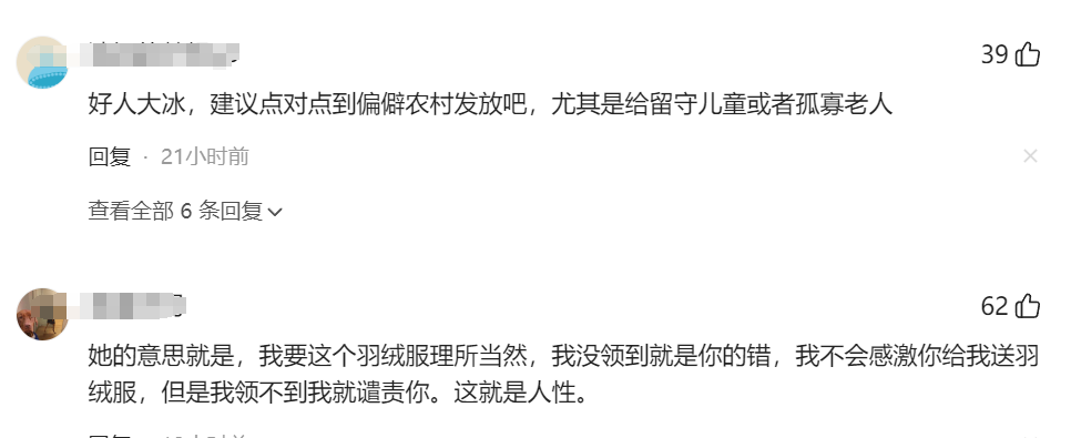 这次风波其实暴露了公益活动中的一个老大难问题:资源永远是有限的,但需求却是无限的,怎么才能保证资源真正送到需要帮助的人手里呢?大冰说了,如果100件羽绒服能有30件被真正需要的人拿到,他就觉得很知足了。他这么想确实很善良,可惜有些人就是要钻空子。