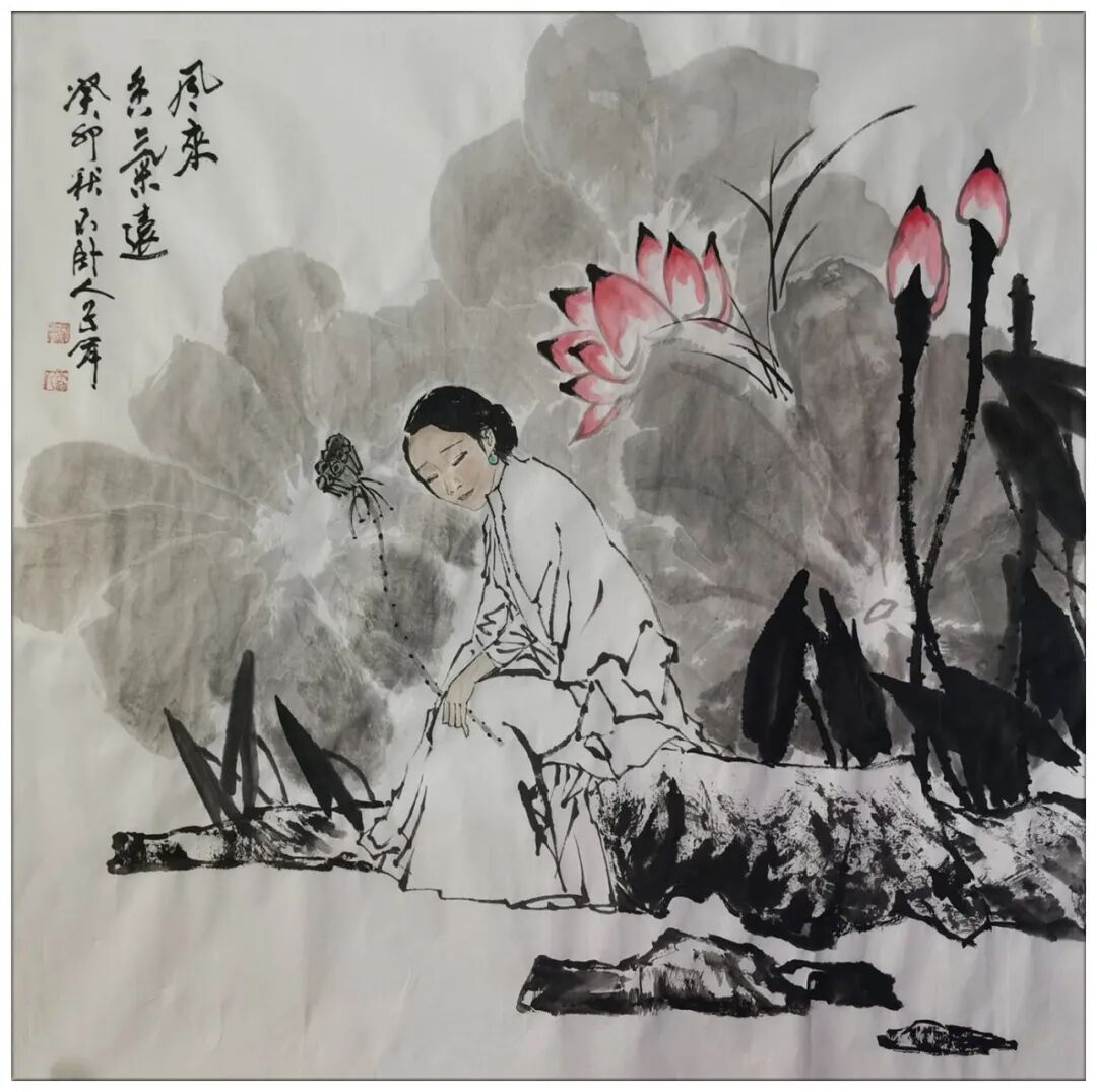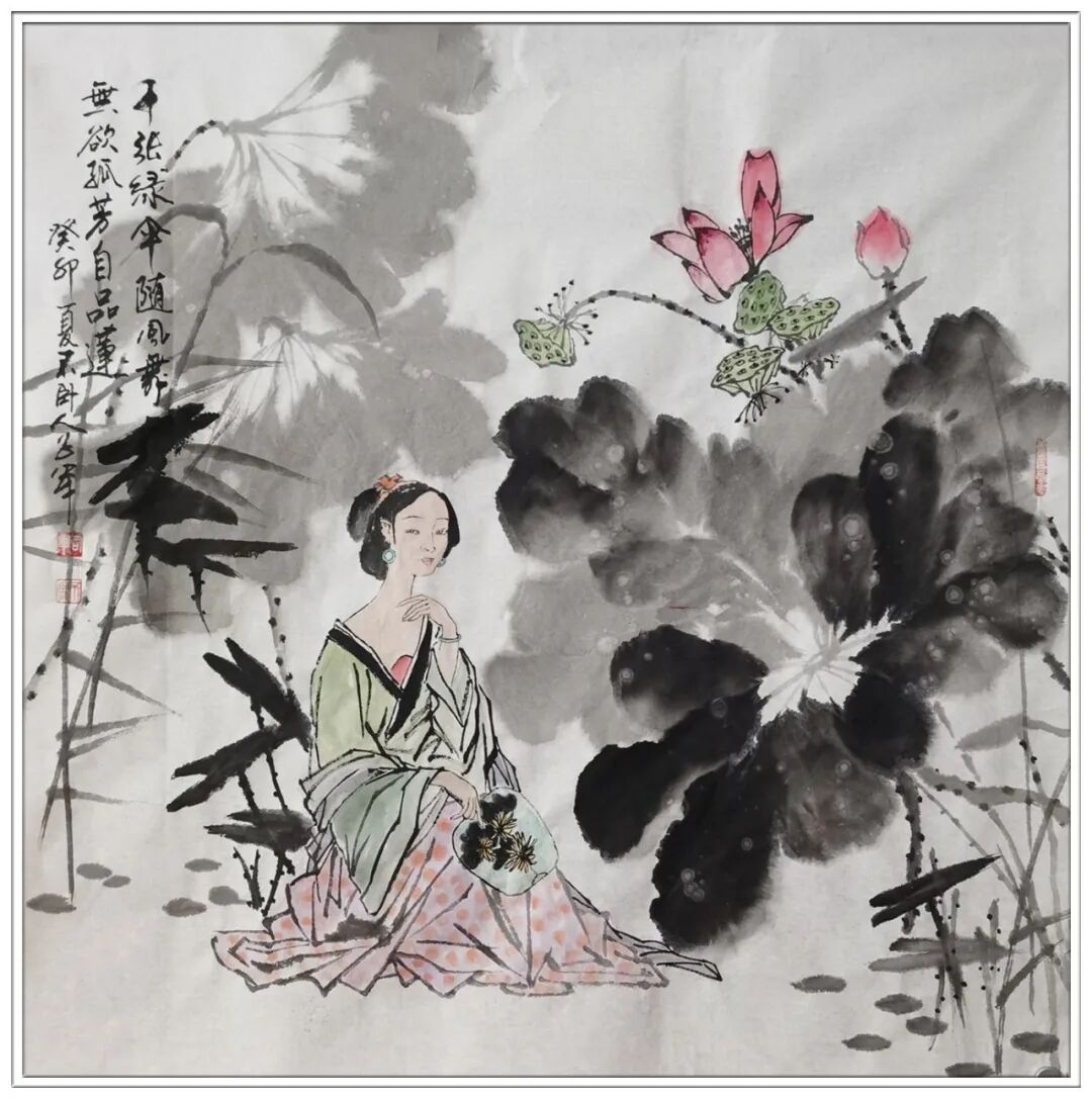 司军先生以人物丹青独步艺林,其笔下仕女顾盼生辉,眼波流转间似有暗香浮动,眉目传情处恍若春水初生。那些云鬓轻挽的佳人,或执纨扇斜倚阑干,或抚琴弦低吟浅唱,衣袂翩跹处尽显盛唐遗韵,朱唇微启时犹带汉宫秋思。观其高士造像,则见虬髯如戟的隐者杖藜行吟于烟岚之间,清癯似竹的文人挥毫泼墨于雪窗之下,嶙峋风骨中透着竹林七贤的孤傲,疏朗笔墨里藏着倪瓒山水的空灵。先生运笔如刀,以焦墨枯笔勾勒出历史人物的精神脊梁;设色若梦,用石青朱砂晕染出古典美人的温婉神韵。每幅绢素都似时光的切片,将千年文脉精髓,经由当代审美淬炼后凝固在宣纸之上。那些看似随意的飞白线条,实则是历经数十载沉淀的匠心独运;那些看似漫不经心的留白处理,恰是参透传统美学后的举重若轻。