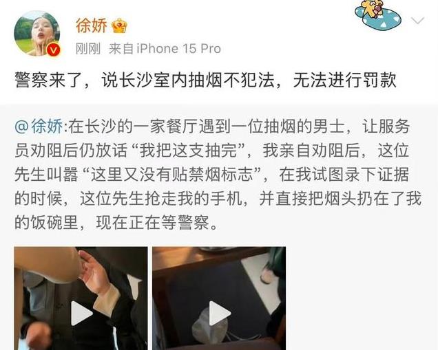 哈哈,就是我们的徐娇小姐姐,这不是在长沙一家餐馆吃饭的时候,因为旁边有人抽烟把烟头丢到她碗里,直接被惹毛了嘛。
