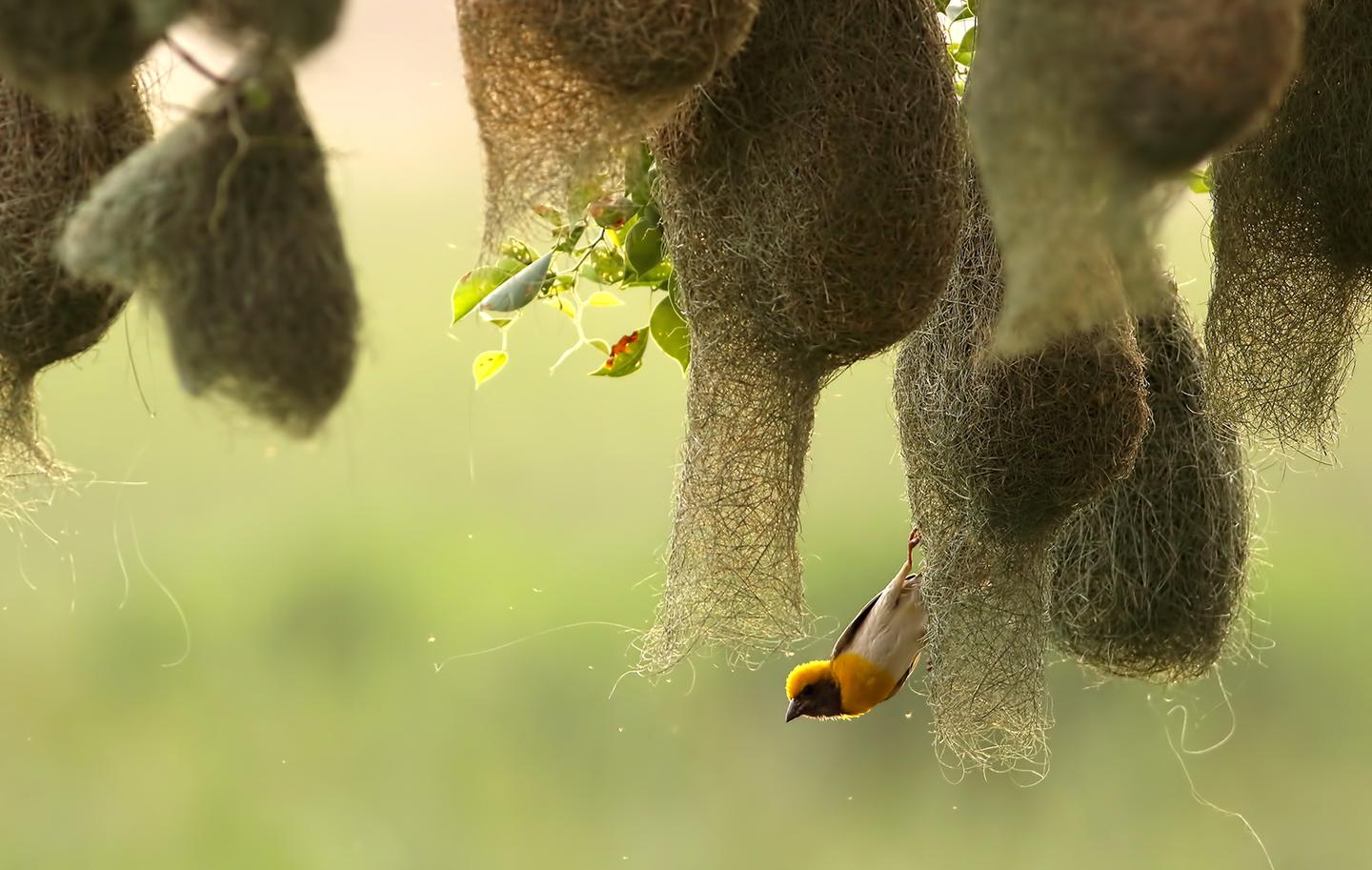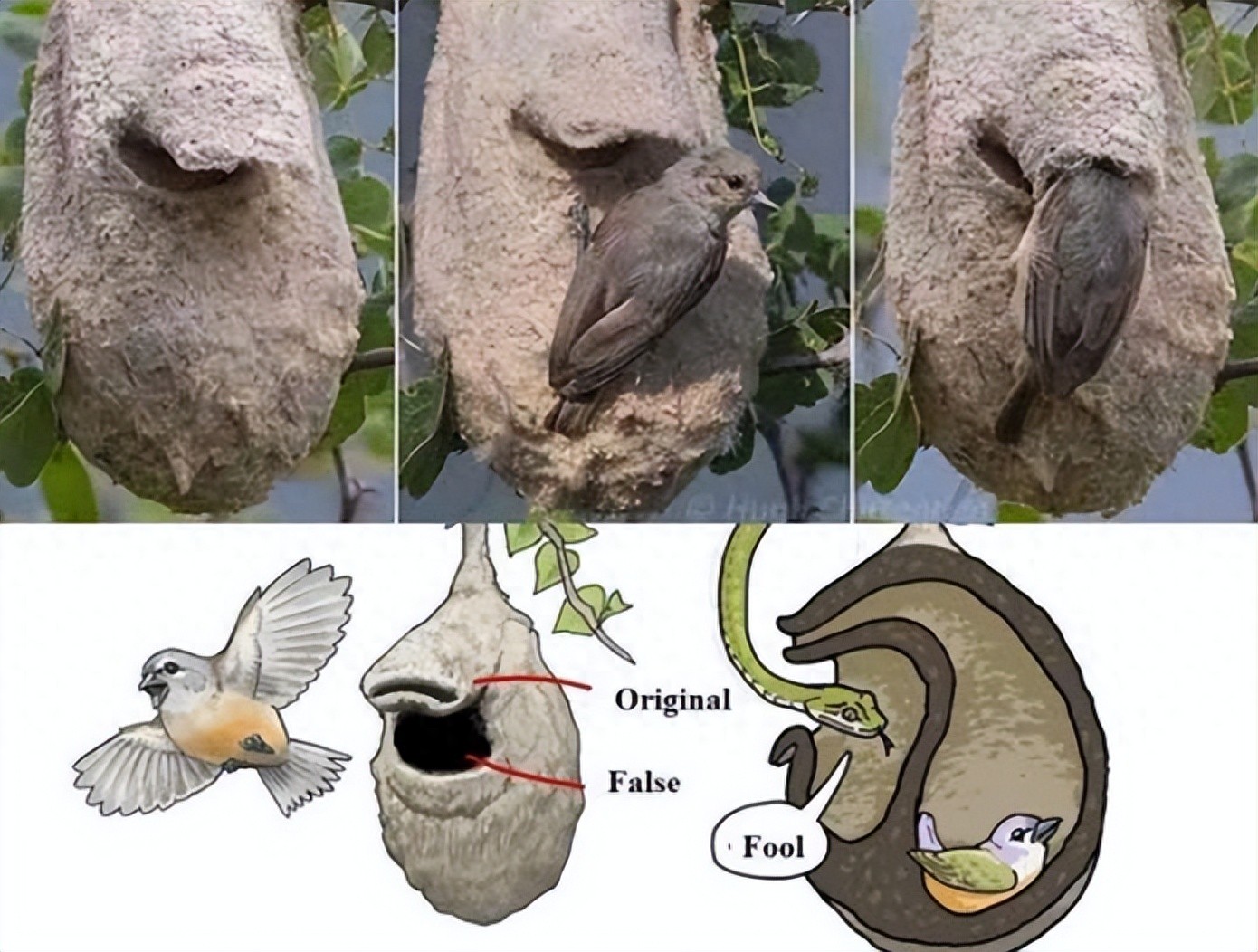 一些筑吊巢的鸟类——如织巢鸟,它们的吊巢将防御蛇类做到更极致,它们会将巢穴入口的通道向下延伸很长距离,以此来让蛇类更加难以触达入口。