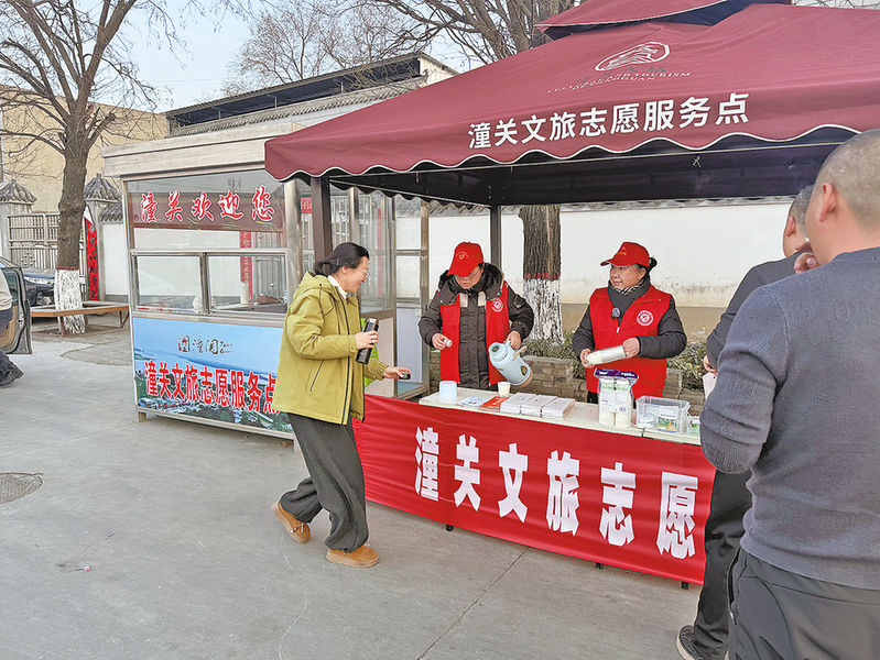 潼关文旅志愿服务点,志愿者暖心服务游客。