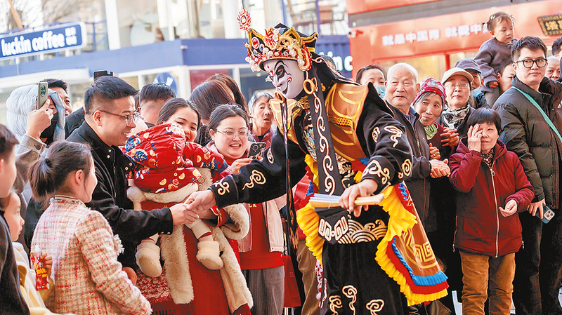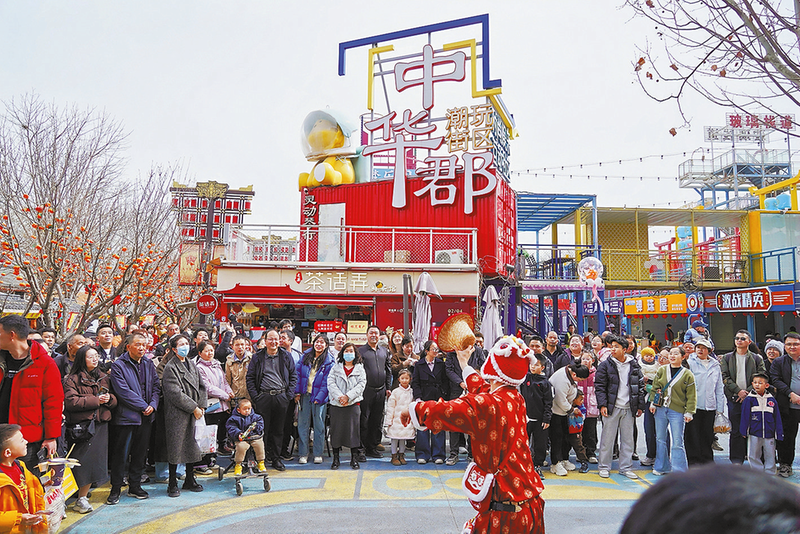 中华郡潮玩街区,热闹的民俗表演吸引游客驻足观赏。