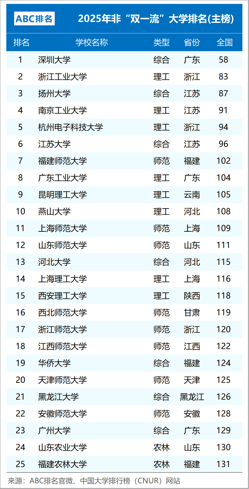 2025年双非高校排名出炉,深圳大学高居榜首,多所大家熟悉的知名双非进入前十就在日前,由CNUR(中国大学排行榜)网站发布的最新版ABC中国高校排行榜中,对非双一流大学进行了单独排名划分,其中有八百五十二所高校入列,这里仅把排名靠前的25所高校列出,以供2025年高考生参考。