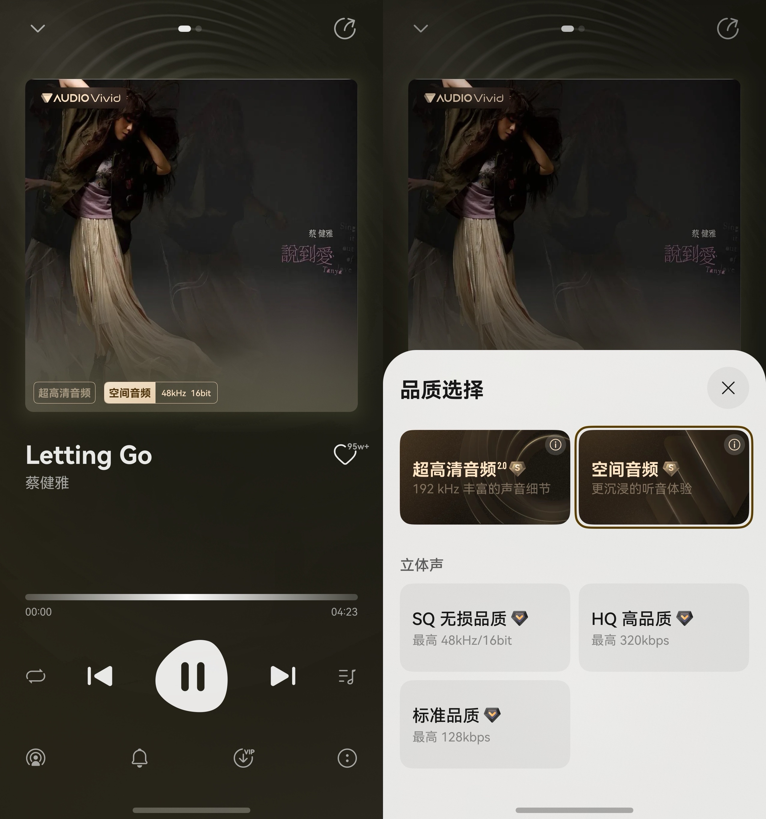 当然,当我想纯粹享受音乐本身时,我会特别关注榜单里那些标注了空间音频的作品。在播放像年度空间音频热单《letting go》时,如果我正好戴着FreeBuds Pro 5这样支持空间音频技术的耳机,我往往会在播放页面-右下角-在线听歌品质中,点击“空间音频”按钮。开启后,乐曲中的宏大编配细节会更加分明,不仅会有被音乐包围的真实感,人声质感也会更加细腻饱满。