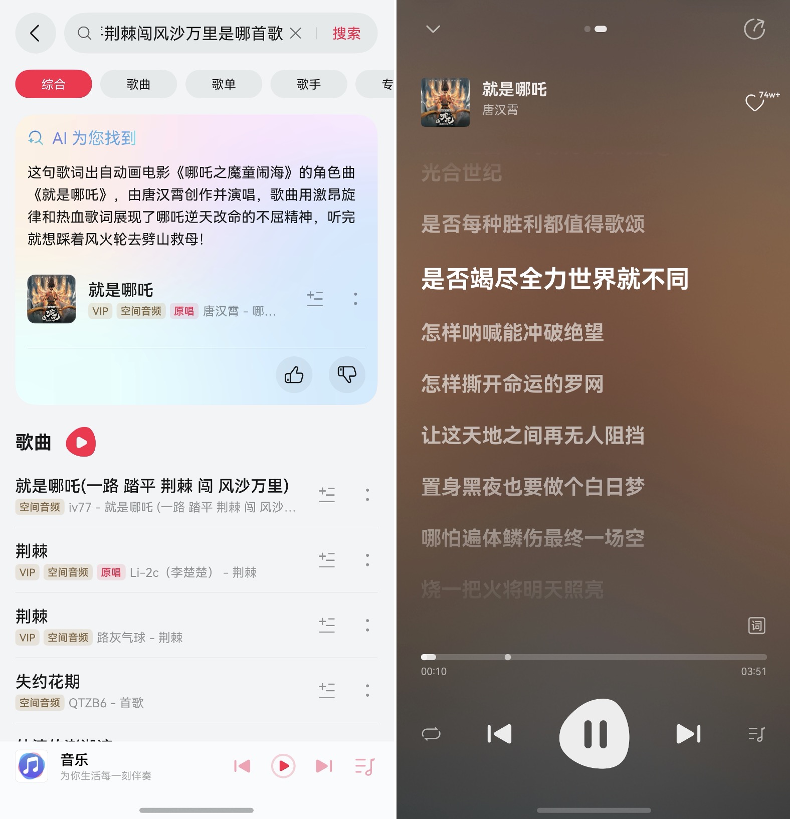 还有一个“AI搜”功能,有时候脑海中闪过一丝旋律,但就是记不起名字来就可以在搜索框直接问,比如:“一路踏平荆棘闯风沙万里是哪首歌?” AI就会帮我找到这句歌词出自哪首歌,点击立刻播放,顺利听到了想听的《就是哪吒》!