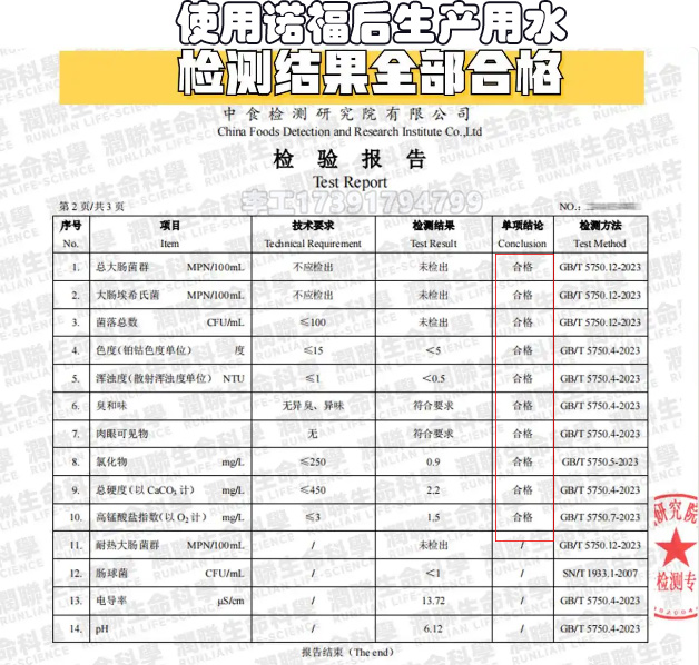 诺福消毒后无残留,无需担心副产物超标,可通过第三方检测验证:消毒后水体菌落总数≤10 CFU/mL,大肠杆菌、霉菌等致病菌未检出,完全满足 HACCP 体系对生产用水的控制要求。