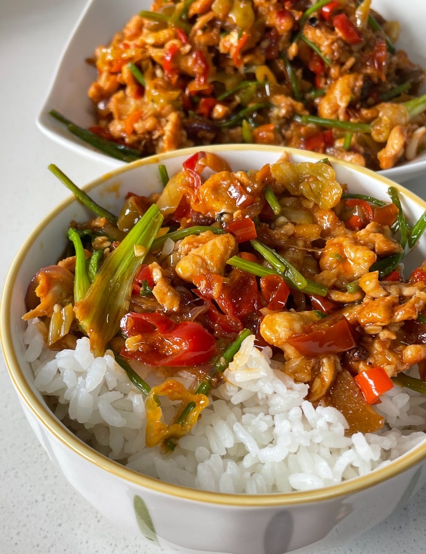 接着,用锅里的底油炒香佐料。放入花椒、蒜末、小米辣圈、泡椒段和洋葱丝,大火快速翻炒出香味。泡椒的酸辣味要充分炒出来,洋葱要炒到微微变软但仍保持脆度,这样才能和鸡肉的嫩形成口感对比,提升菜品的层次感。然后倒入之前滑炒好的鸡胸肉片,快速翻炒均匀,让鸡肉裹上佐料的香味。