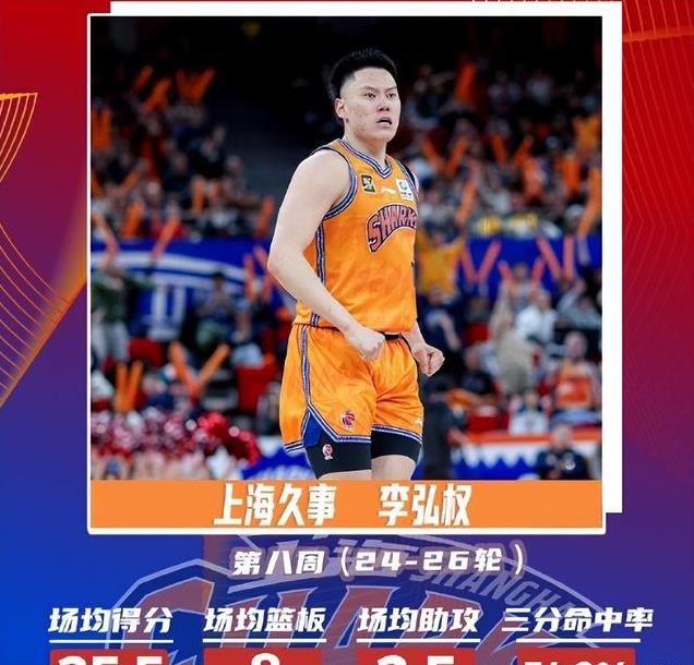 其次,上海男篮本土球员李弘权入选了CBA联赛第八周最佳阵容,他替补出战38分钟高效率得到18分3篮板4助攻1抢断1盖帽的全面数据。在之前的几场比赛,李弘权在41分钟出战时间可以稳定贡献25.5分8篮板,这名球员逐步打出了身价,也非常有望入选新一期国家队。