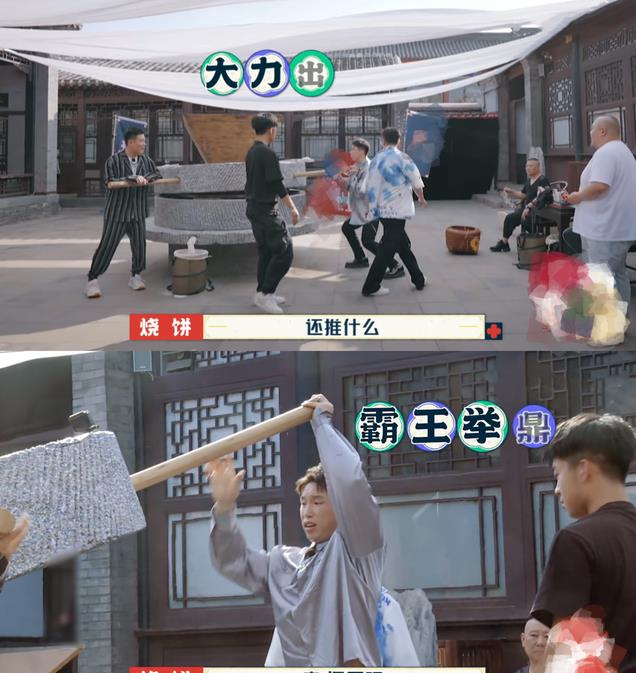 最后烧饼看不下去了直接上去单手就把石磨抬起来了,嘴里说到:“擓面吧,擓吧”,给众人都笑了,不知道当时的嘉宾是笑没有抬起来石磨的嘉宾是小烧饼的动作,总体来说还是很欢乐的。