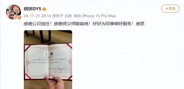 就在11月21日晚上,烧饼的身份突然变成了德云社的副总经理,至于怎么知道的,那就是烧饼都已经把聘书给晒出来了。