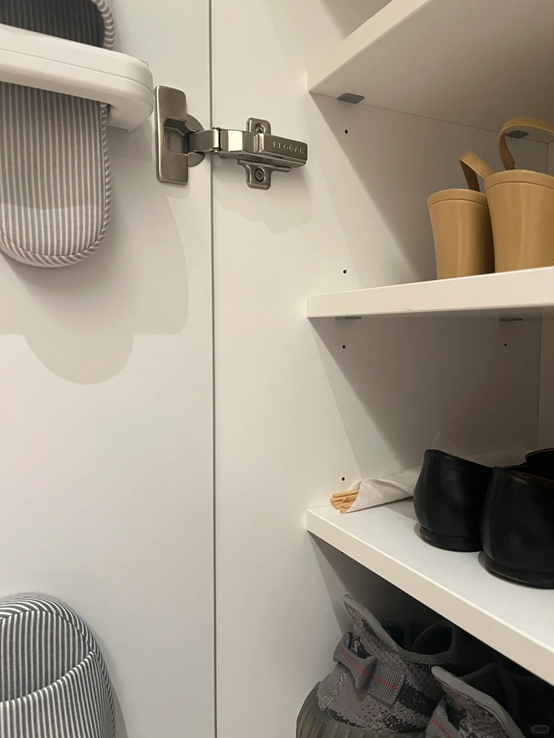 然后在柜门上面安装拖鞋置物架或者是直接加上一个简单的横杆,这样收纳空间就直接能够翻倍了。