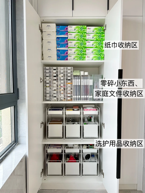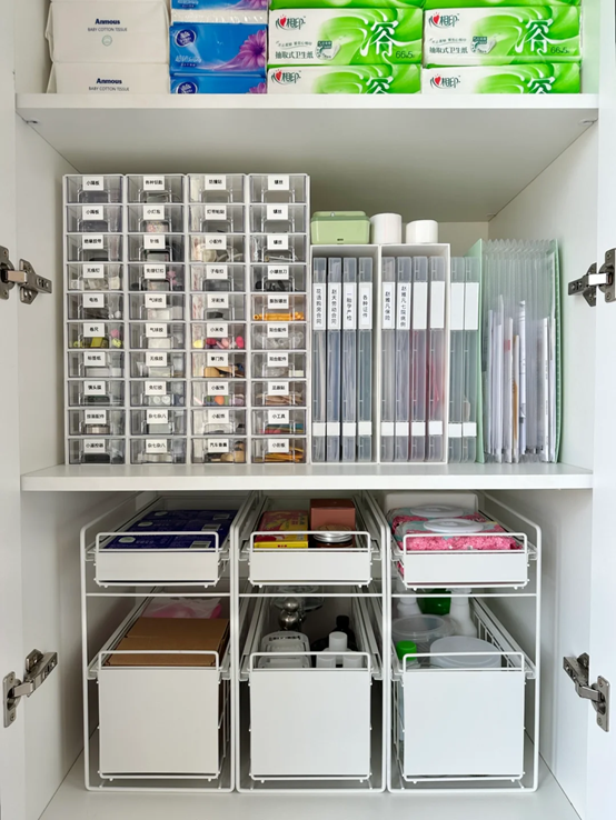 比如小一点的收纳盒,风琴收纳袋,双层抽拉置物架,这样将不同的物品放置在各自的位置上,规整又方便找取。