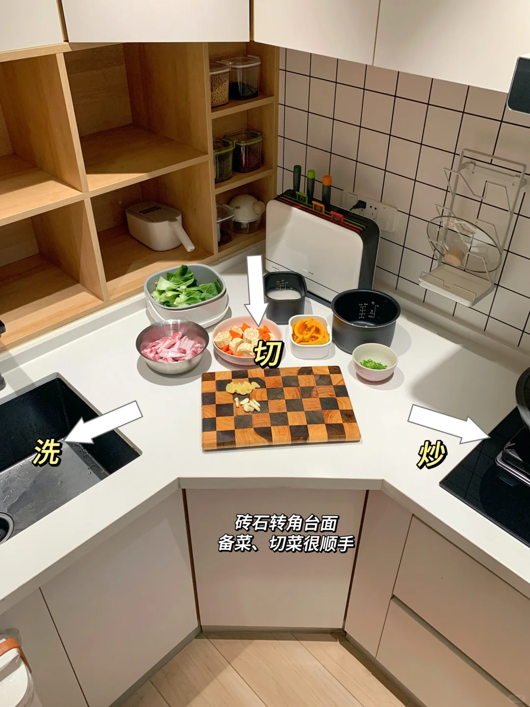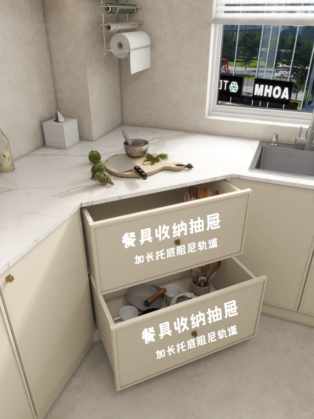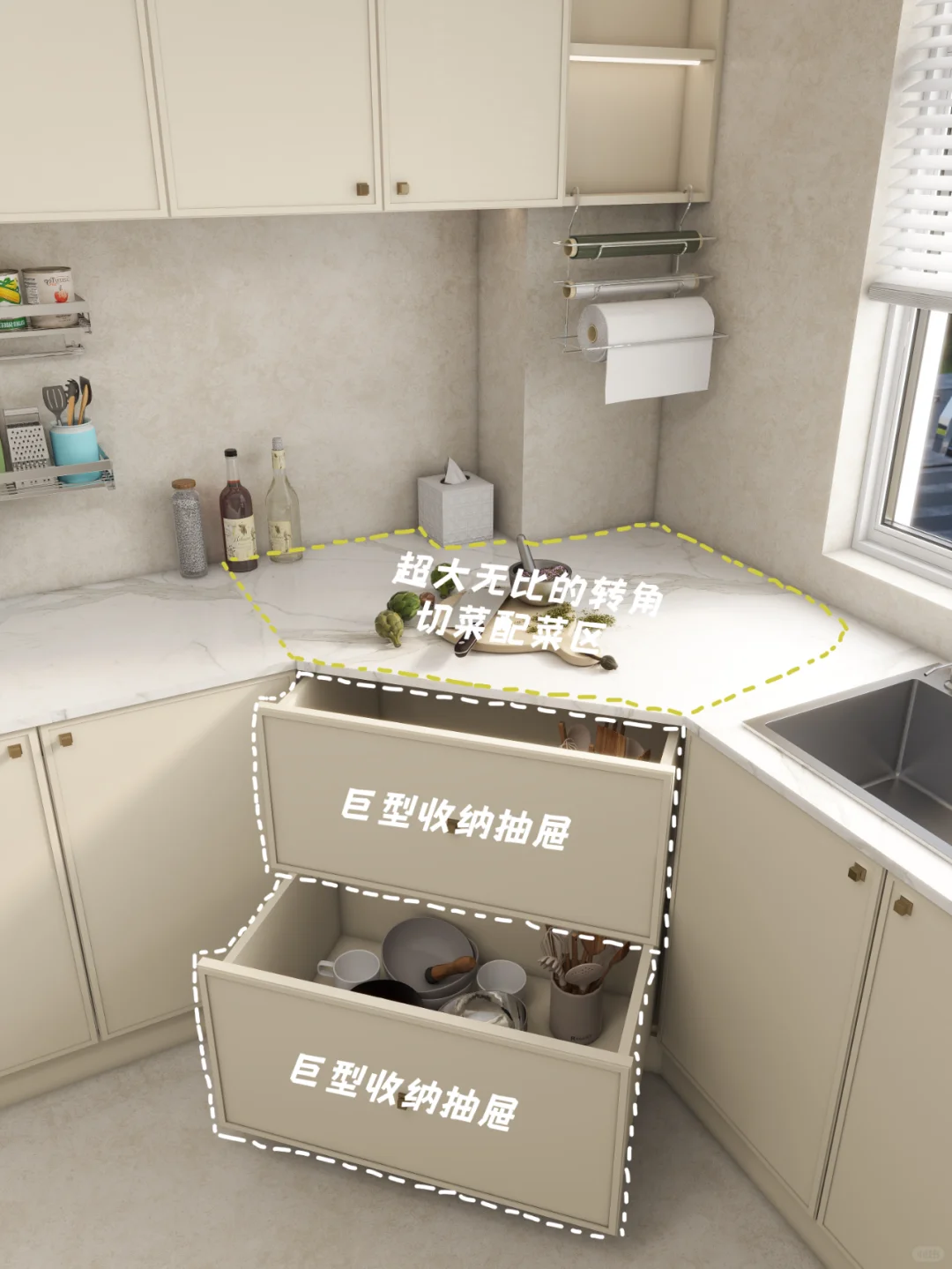 转角柜除了可以选择隔板设计以外,也可以直接设计收纳抽屉,
