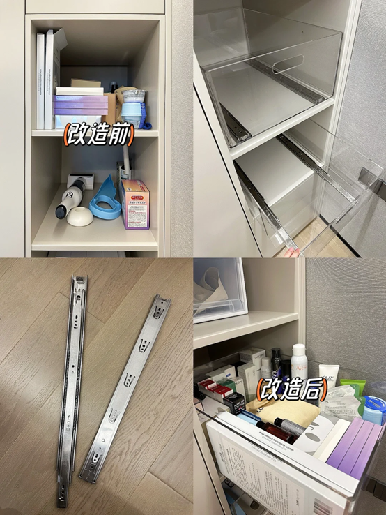 在改造梳妆台的时候,大家可以提前在网上购买一对轨道,加上亚克力托盘,再准备一点纳米胶,这样就可以完美解决梳妆台的收纳问题了。