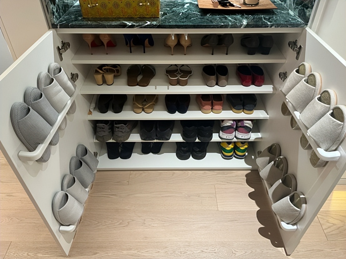 将鞋柜内部的层板内缩10公分左右,然后在鞋柜的柜门上面安装置物架,这样就可以将拖鞋放置在柜门上了,轻轻松松就能多放下10多双鞋子。