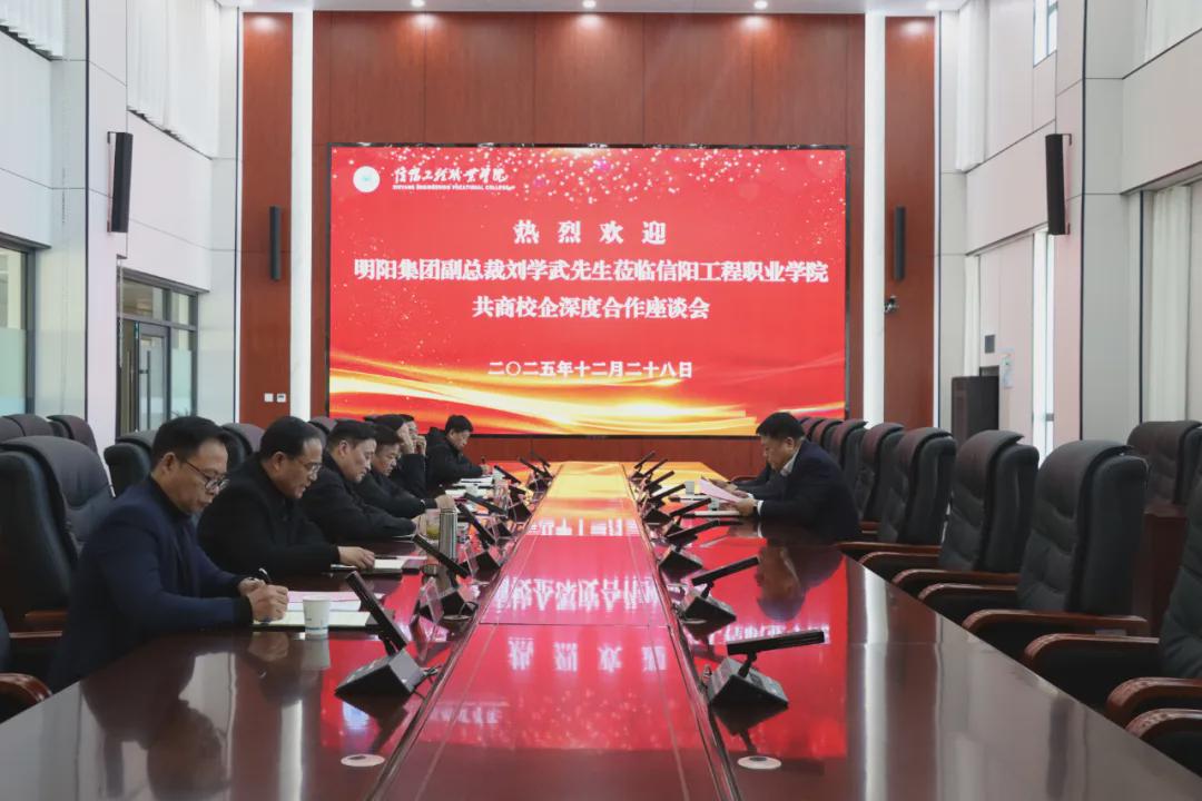12月28日下午,明阳集团副总裁、中部大区董事长刘学武莅临信阳工程职业学院,双方围绕推进深度合作举行座谈。河南世纪教育集团总经理、信阳工程职业学院副理事长张东斌,党委副书记、校长黄功学,监事会监事长张卫兵,常务副校长杨金国等校领导及相关职能部门、二级学院负责人参加。座谈会由张卫兵主持。