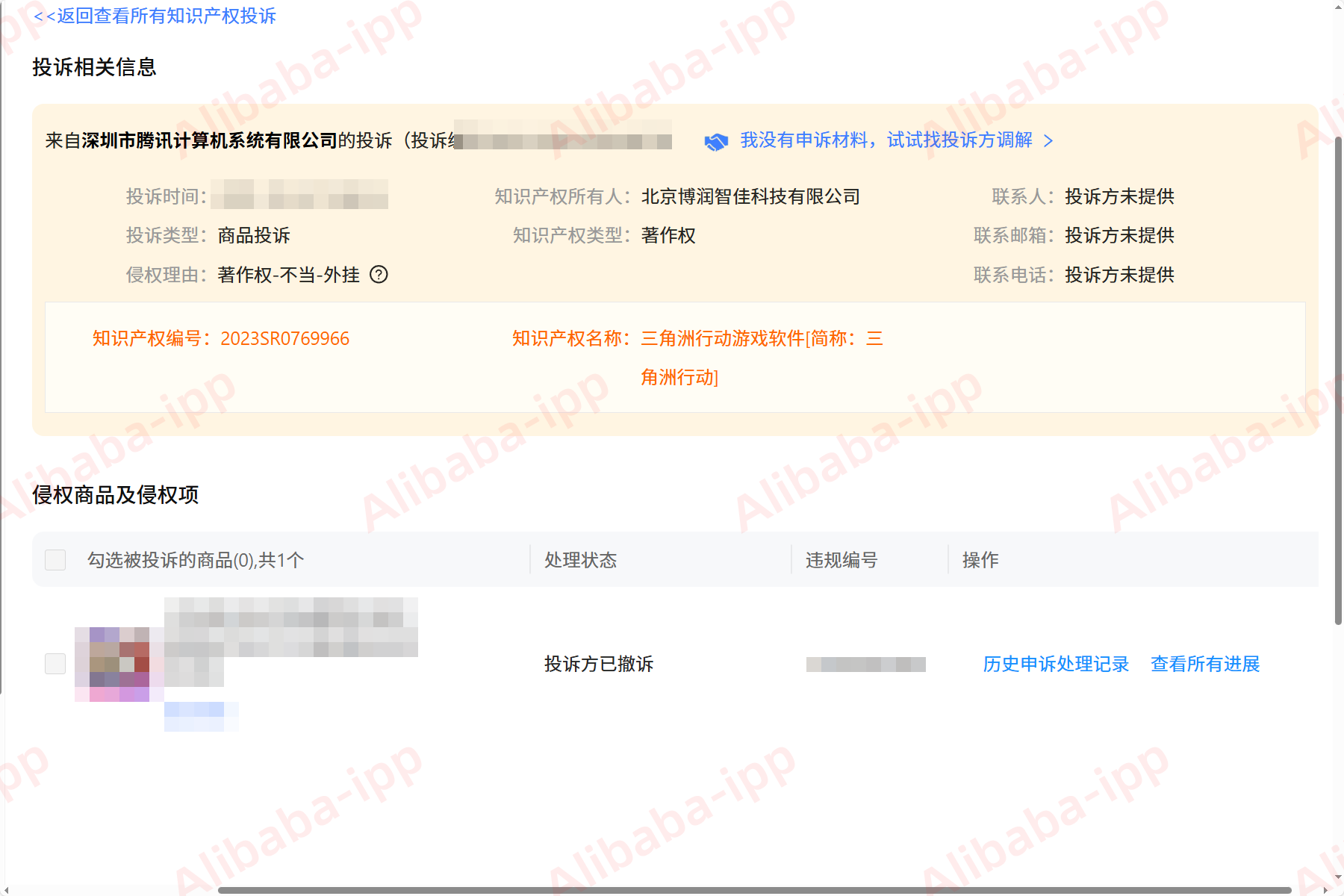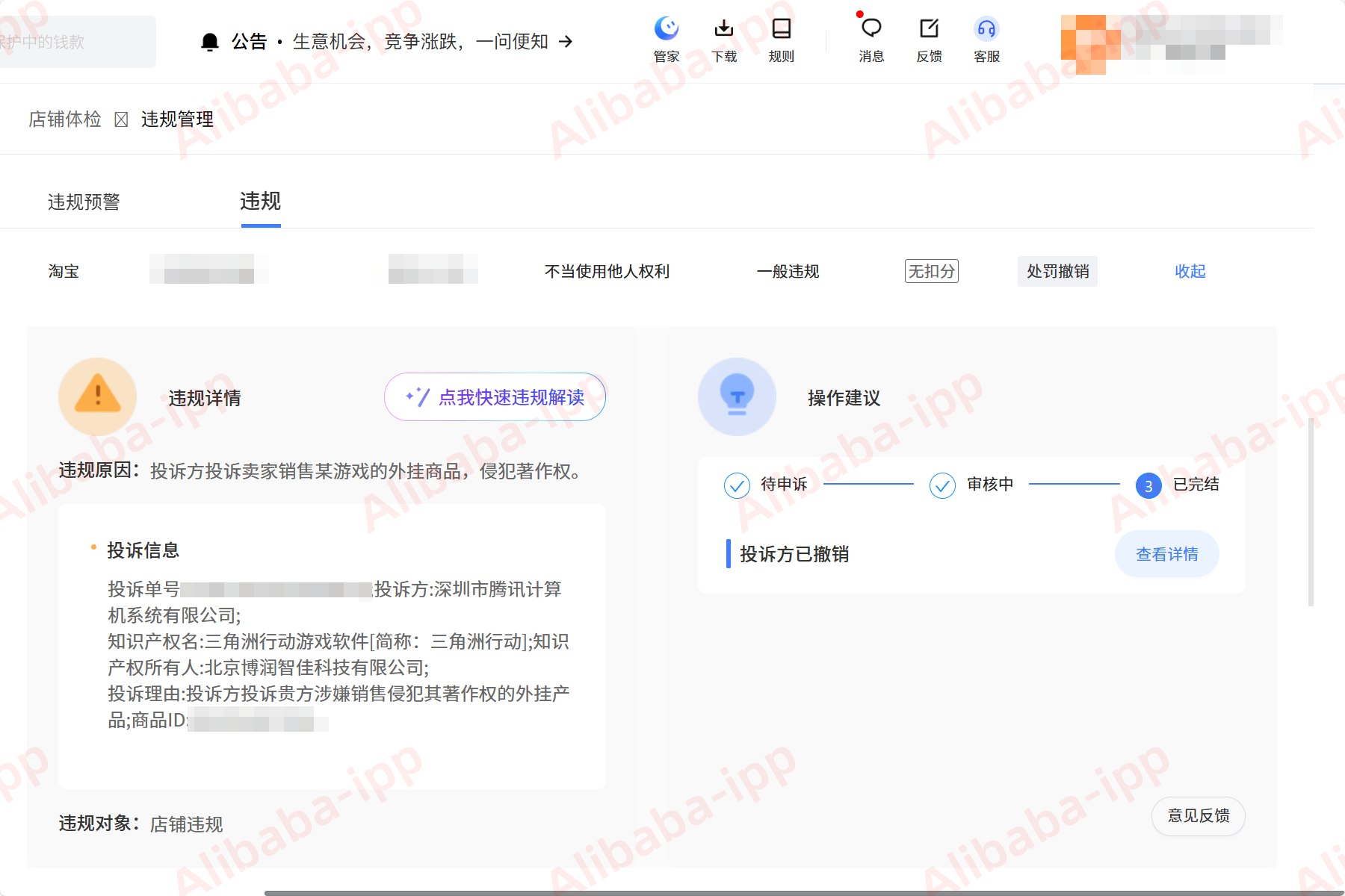 一、投诉突然降临在“三角洲行动”游戏风靡之际,不少淘宝商家看准了玩家对游戏体验提升的需求,推出了名为“三角洲护航”的陪伴指导服务。然而,平静的运营被一纸投诉打破。知识产权所有人 北京博润智佳科技有限公司,依据其持有的 2023SR0769966 号软件著作权“三角洲行动游戏软件[简称:三角洲行动]”,发起了一起 著作权-不当-外挂 类型的投诉。投诉方认为,卖家销售的是破坏游戏平衡的外挂商品,这直接导致被投诉的商品链接面临删除风险,店铺运营也可能受到进一步影响。