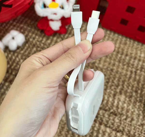 在便携性方面,这款充电宝堪称典范——体积仅相当于一包手帕纸,重量控制在179克,轻松放入衣袋或背包毫无负担。更贴心的是,它采用机线一体化设计,内置Type-C和Lightning双接口数据线,即插即用,还能将线缆当作提手使用,真正实现随身携带“零压力”。