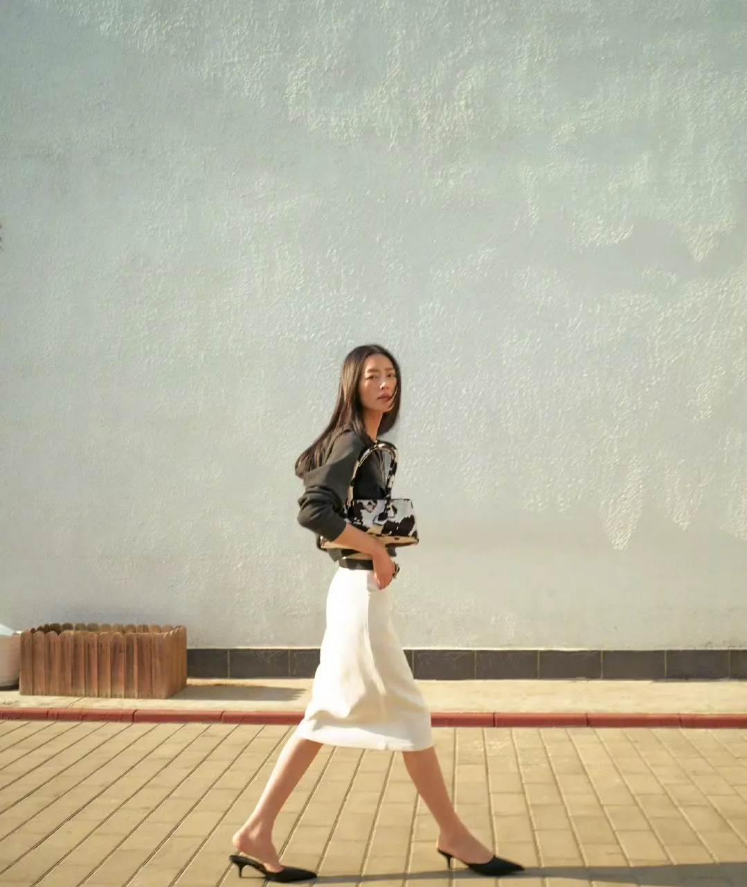 米白色半身裙,优雅大方下半身搭配的米白色直筒半身裙,是这套穿搭中的又一亮点。米白色,如同初夏清晨的第一缕曙光,柔和而温暖,与灰色卫衣形成了色彩上的完美呼应,营造出一种清新、淡雅的视觉氛围。