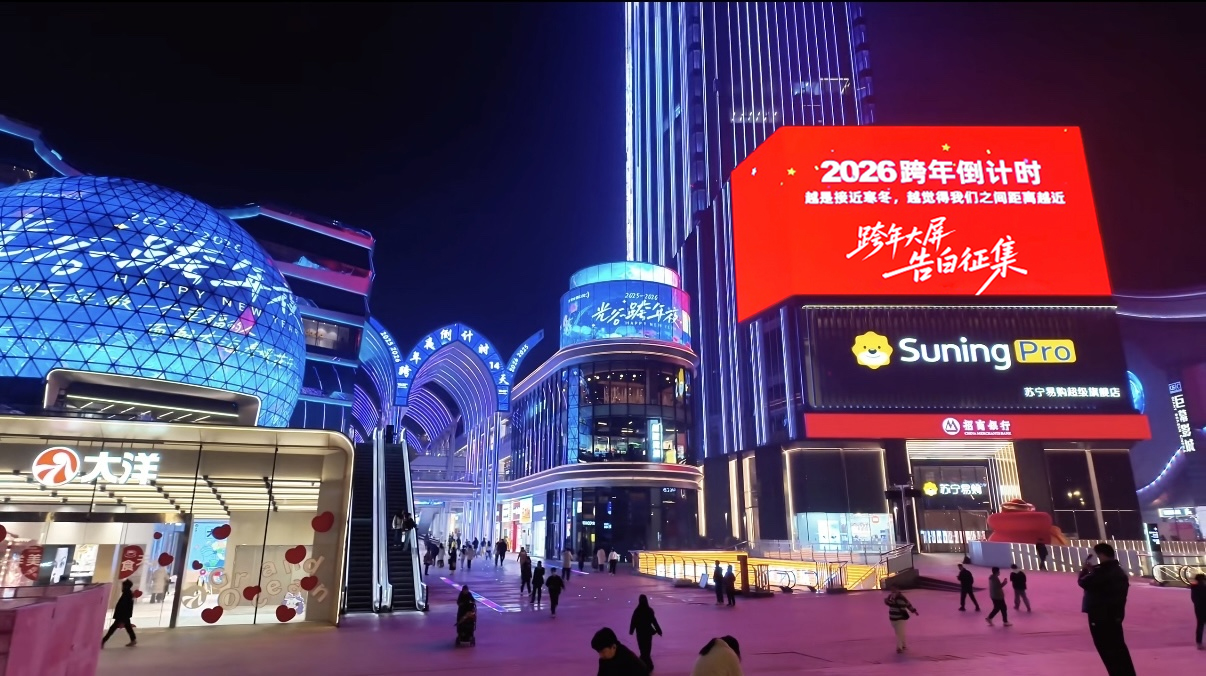 在湖北武汉,Suning Pro武汉光谷世界城店发起“跨年大屏告白”活动,以商圈内被称为“宇宙中心”的巨幕为展示平台,面向全城征集告白留言,并将在跨年夜进行轮播,让真情实感在城市的夜景下被见证,将跨年活动升级为一场城市级的情感互动。
