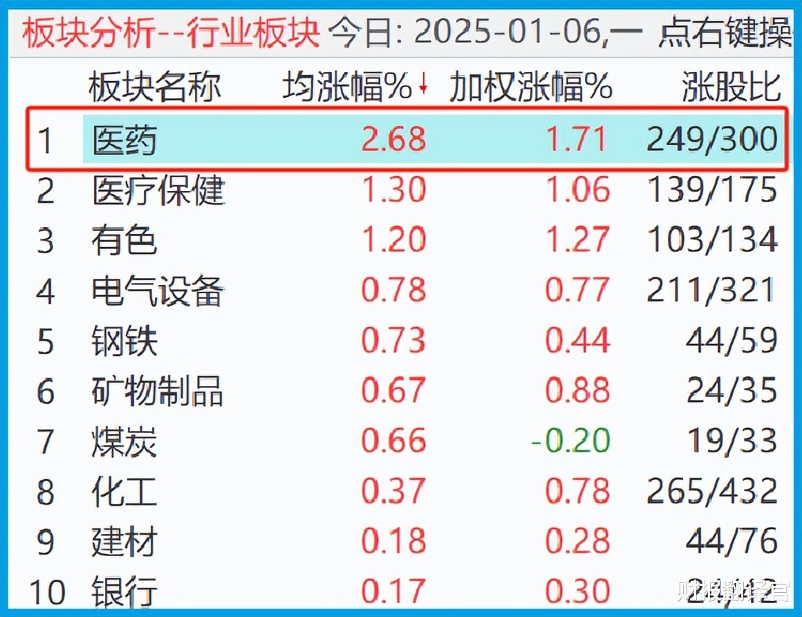 而虽然今天的A股出现了下跌,但是医药板块却逆势拉升,截至中午收盘时,医药板块的平均涨幅为2.04%,并在A股56个行业板块中位居第一的位置。