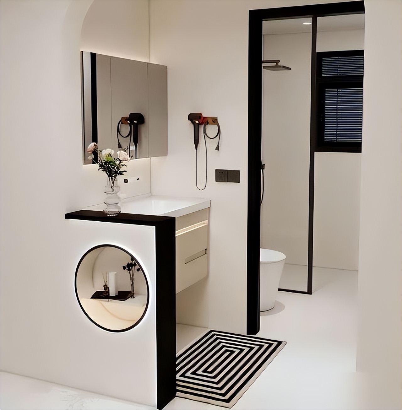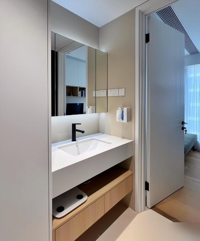 后来干脆把盥洗区搬到走廊,巴掌大的过道塞下60cm宽的石英石台面,镜柜一关,牙膏洗面奶全隐身。
