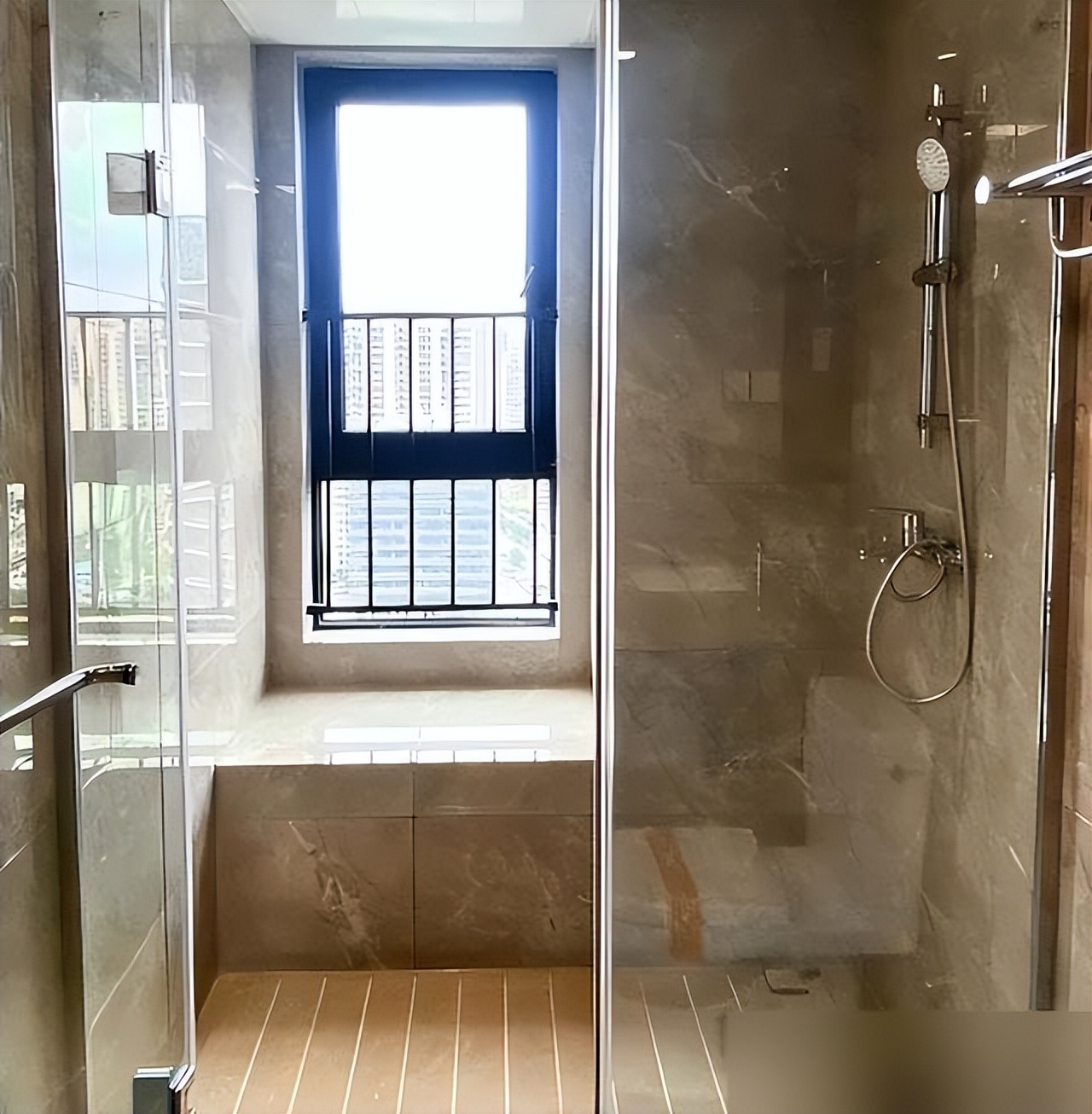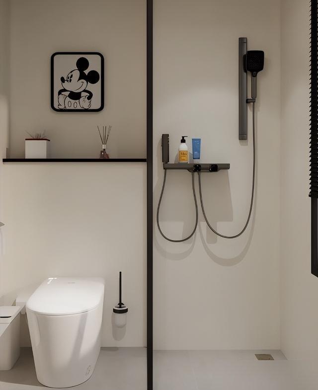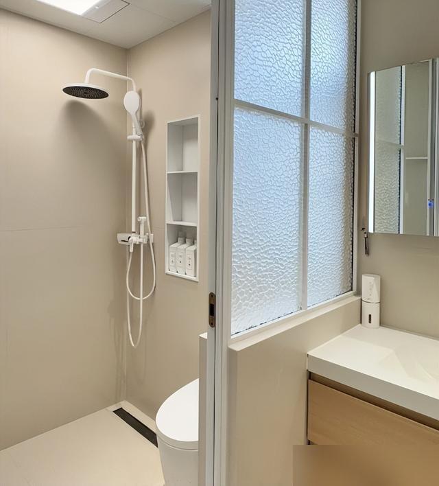 淋浴区更绝:只做半面10mm玻璃到腰,水汽往上飘被顶扇吸走,地砖选30°灰通体哑光,水渍隐形术满分。