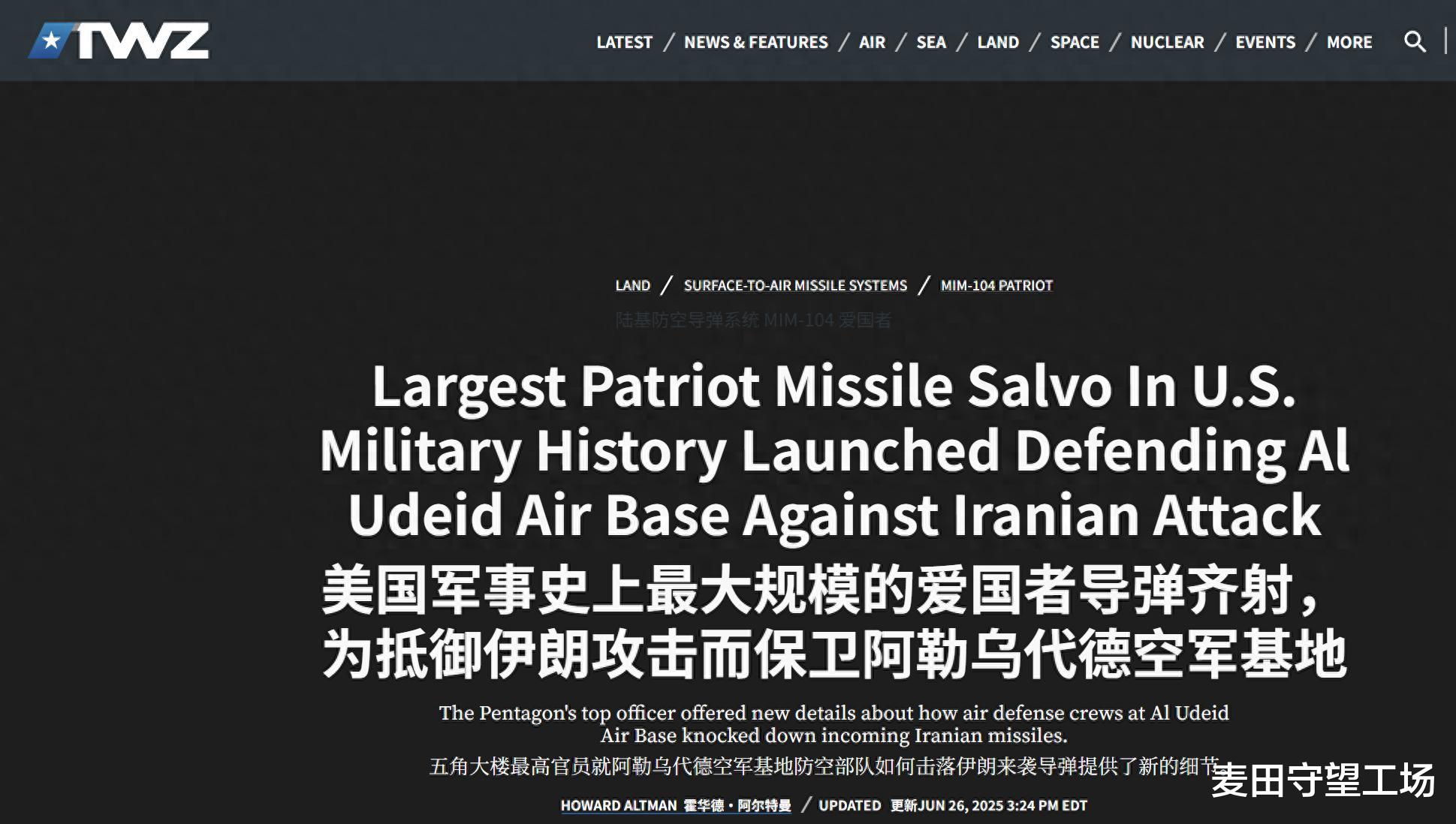伊朗为了报复美国空袭核设施,在2025年6月23日晚上发射弹道导弹突袭卡塔尔的乌代德空军基地。虽然美国总统特朗普宣布,美军成功抵御导弹袭击,没有任何损失,但是美国媒体《战区》在报道中承认,伊朗导弹突袭卡塔尔后,美军发现自己闯下大祸。虽然对外可以宣称“保卫乌代德空军基地的战斗大获全胜”,实则消耗了大量的防空导弹,保护的只是一个“几乎空无一人”的乌代德空军基地。