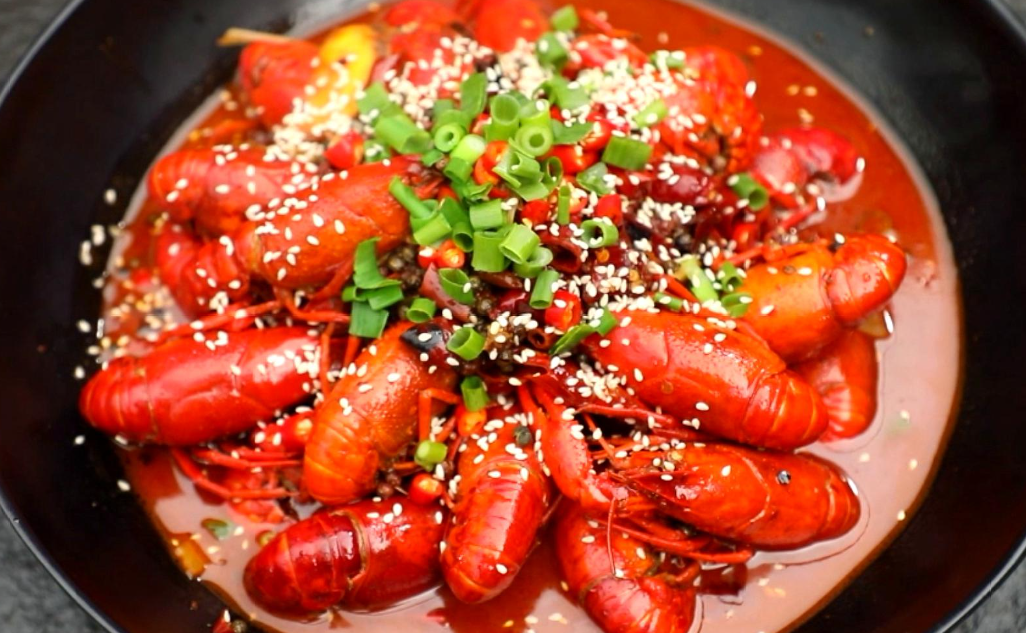 然后把我们炸好的小龙虾给它放进来,然后盖上锅盖,大火烧开,小火焖煮一到两分钟,时间到了之后不要着急装盘儿,放在这里,再给它闷上20分钟左右,这样我们烧出的小龙虾更加的入味儿,好吃。时间到,我们打开盖子,真的是太香了,颜色非常的漂亮,这个时候我们往里面淋入适量的小磨香油,然后再把盖子迅速盖上,关火,放在这里再给它焖上20分钟,这样我们做出来的小龙虾更加的入味好吃。 20分钟之后,我们打开盖子看一下,这个颜色非常的漂亮,红亮红亮的。然后我们给它盛出装盘儿,然后我们给它均匀地摆入一个白色的盘子中,再把这个汤汁均匀的浇在这个龙虾上面,上面撒入少许提前炒熟的白芝麻,再来少许的葱花点缀一下。好啦,像这样一盘非常好吃好看的13香小龙虾就制作完成了,端上桌就可以给家人美美的享用啦。哇,真的是太香了,馋得我的口水直流啊。里面的虾肉怎么样,特别的q弹呀。真的是太香了,一点都不腥哦,非常的入味好吃。天气越来越热了,为家人来上一份儿这样的13香小龙虾,真的是超级的下饭又解馋哟,比蒜蓉小龙虾还要好吃十倍呦。