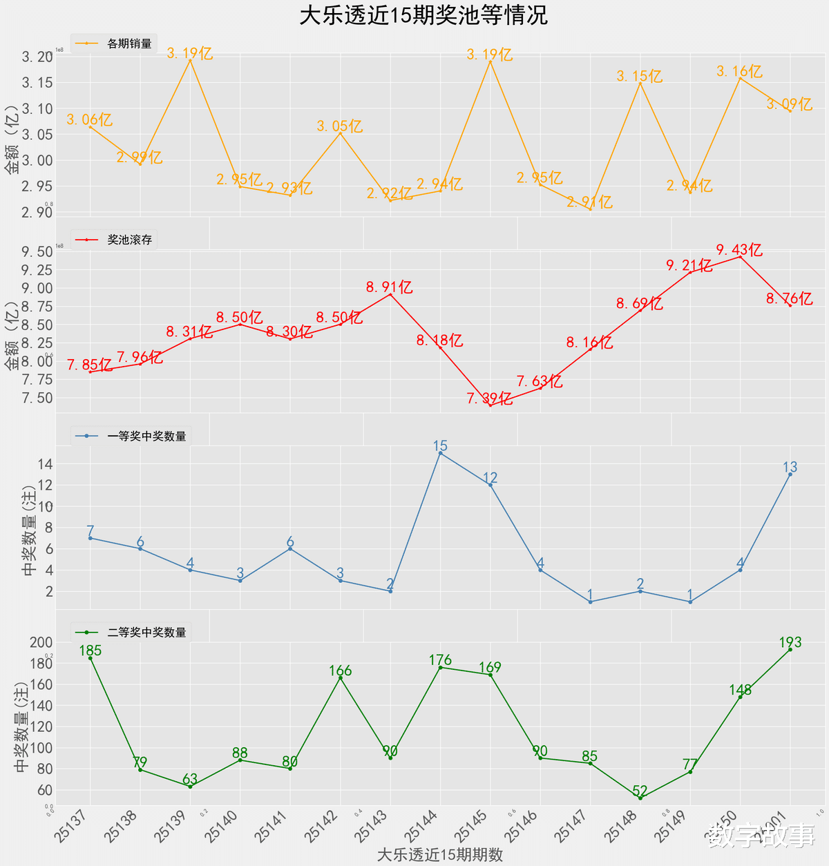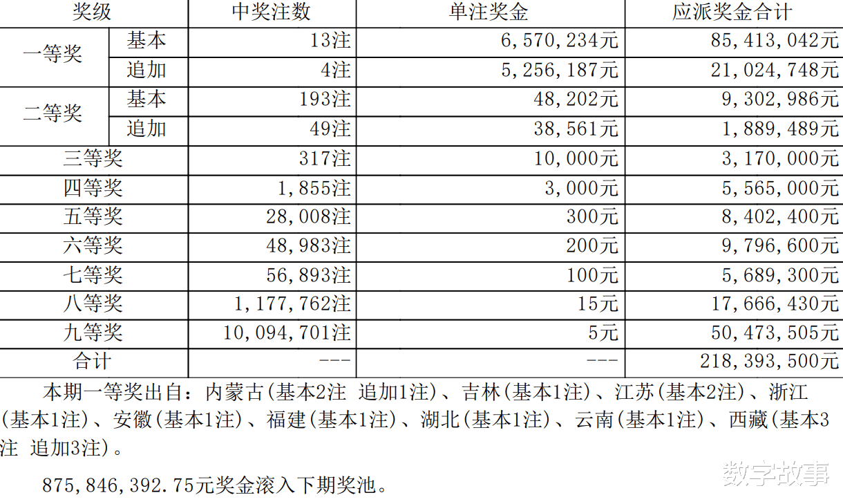 大乐透26001期一等奖:13注,追加: 4注二等奖:193注,追加: 49注。本期全国销售金额:3.095 亿 奖池滚存:8.758 亿.近15期奖池滚存, 中奖情况等信息:
