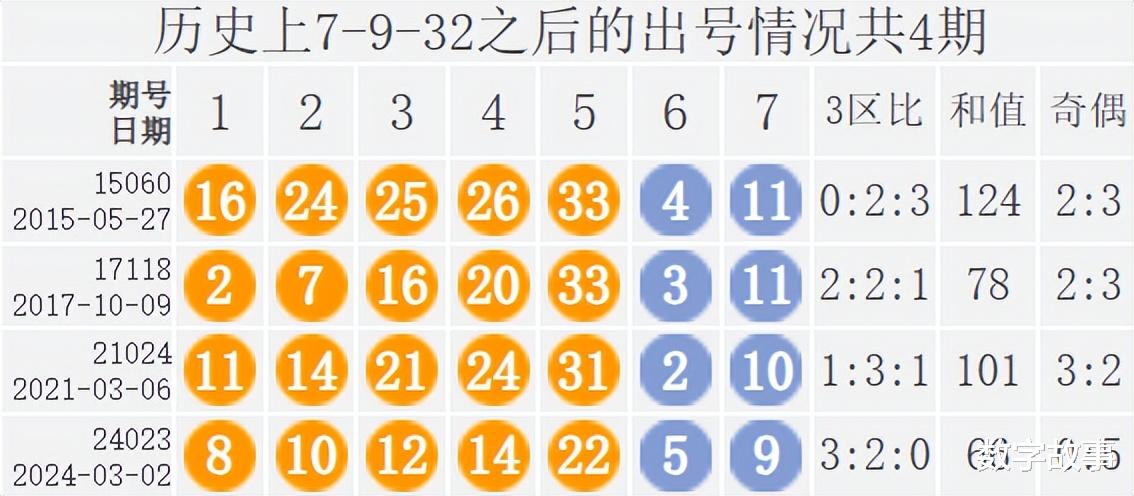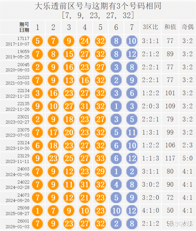 大乐透26001期前区号在过去是否出现过?大乐透26001期前区号: 7-9-23-27-32经查,历史上没有出现过与这一期5个前区号一样的,4个前区号一样的有1期,如下: