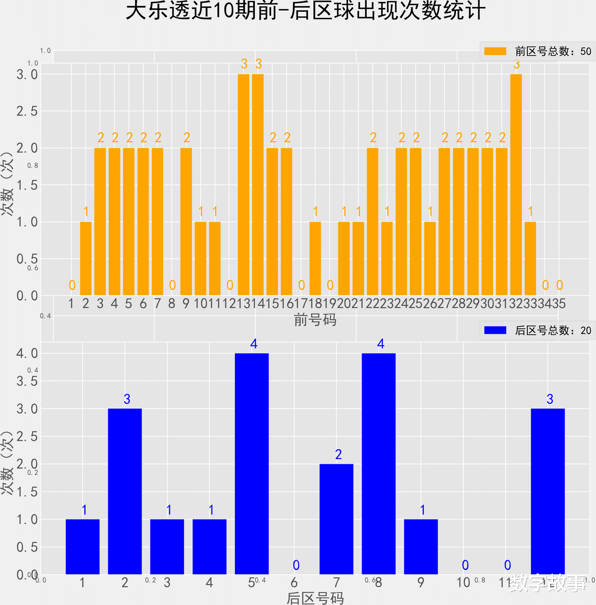 大乐透近10期前后区号统计情况统计样本数据: 50个前区号码 20个后区号码