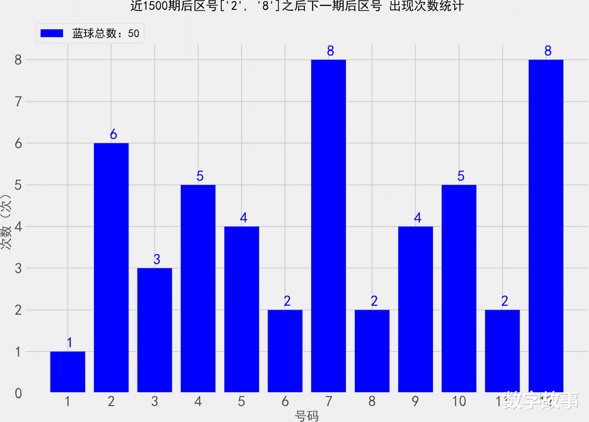 统计近1500期后区号2-8之后, 各后区号的出现次数大乐透26001期后区号是2-8找出近1500期后区2-8号之后,下一期出现的所有后区号,统计其出现次数。除开这一期,共出现了25次2-8后区号那么统计的样本数据是50个