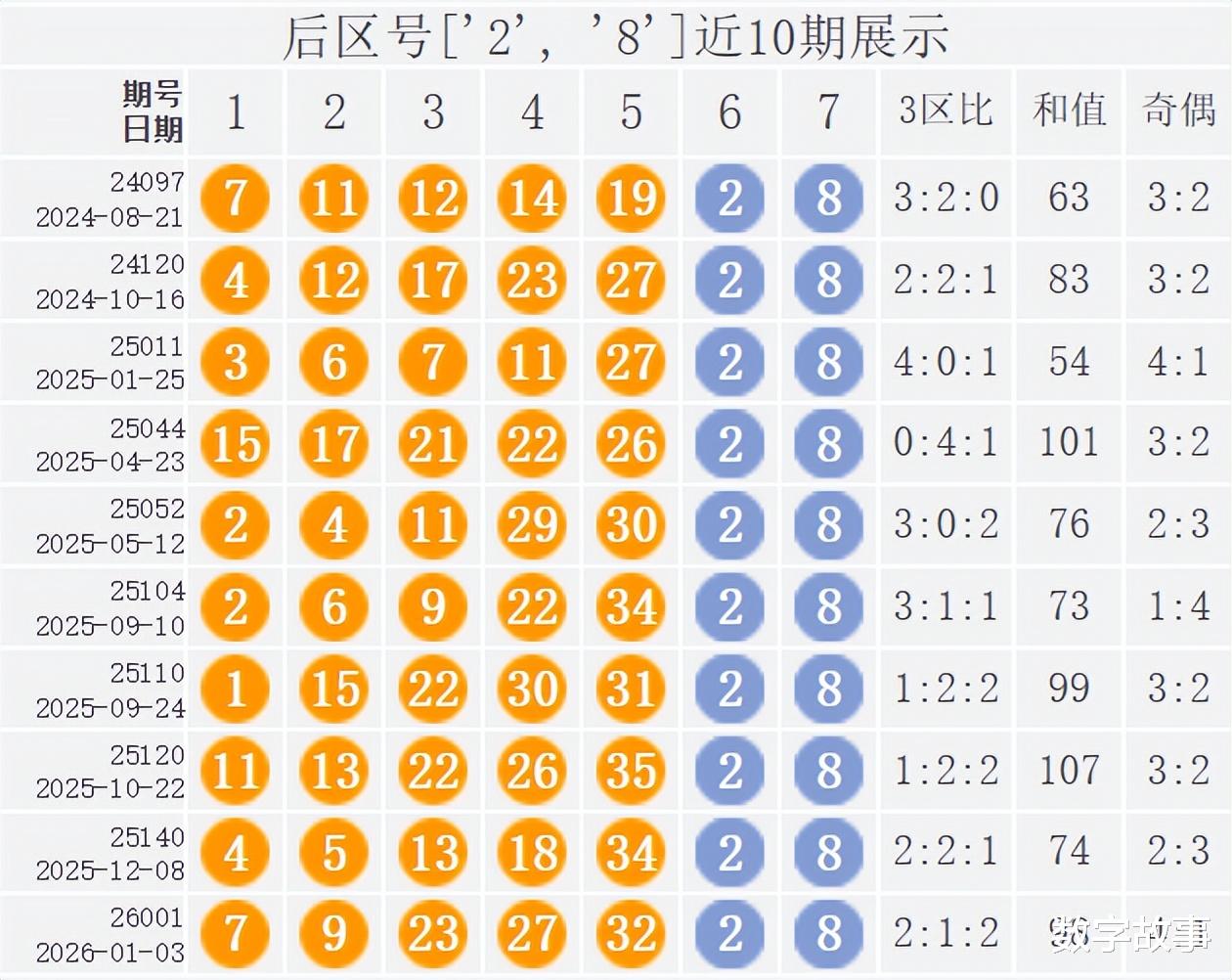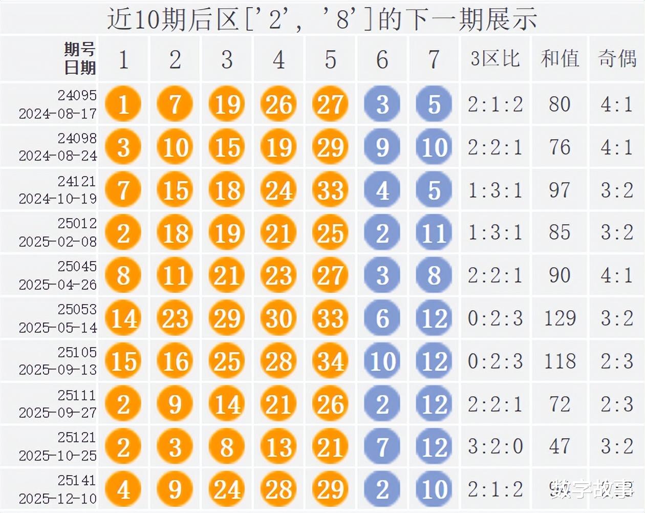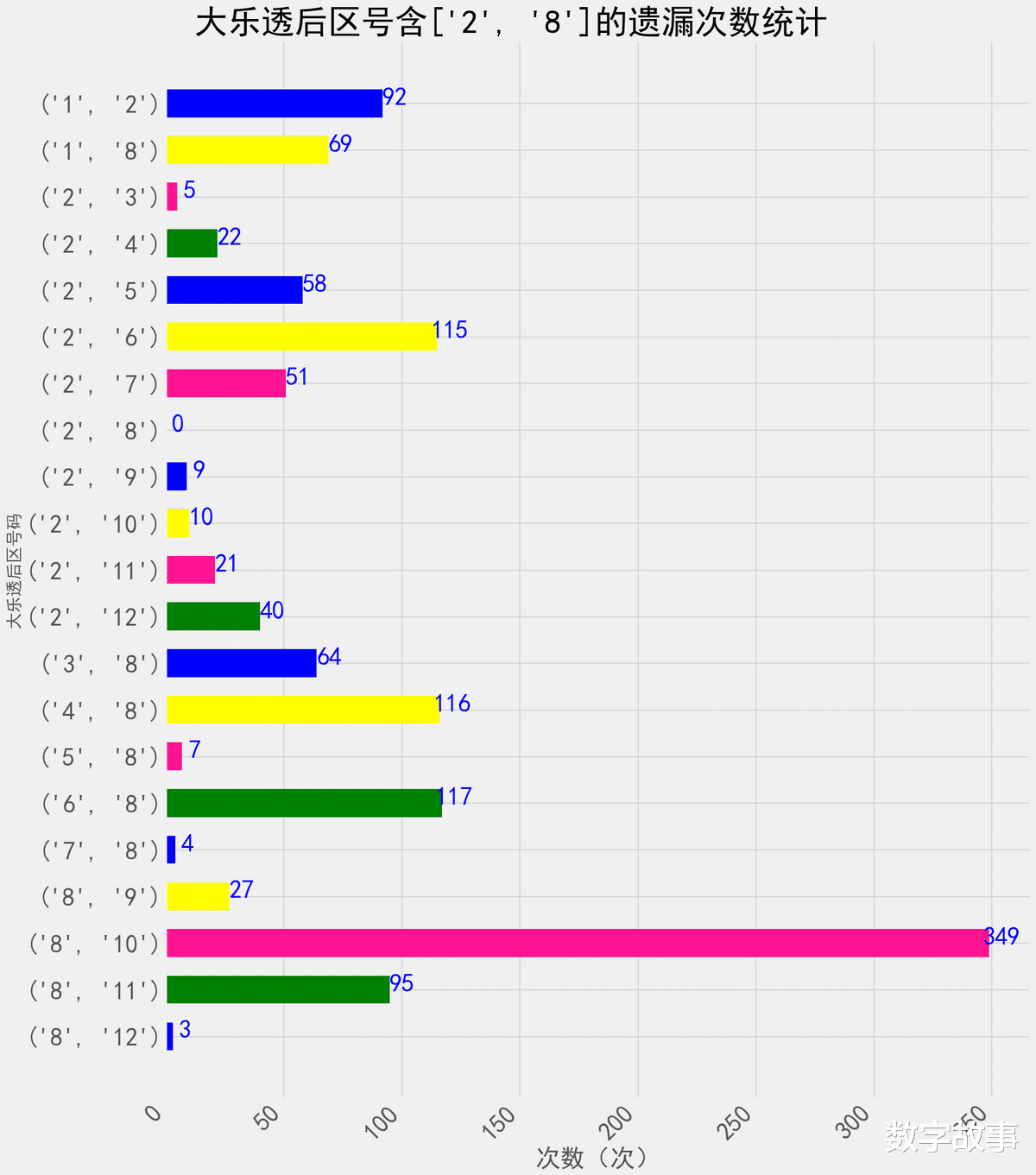 大乐透后区含2或8的双号遗漏次数统计大乐透后区组合2-8近150期出了8次,这次中断了10期遗漏。