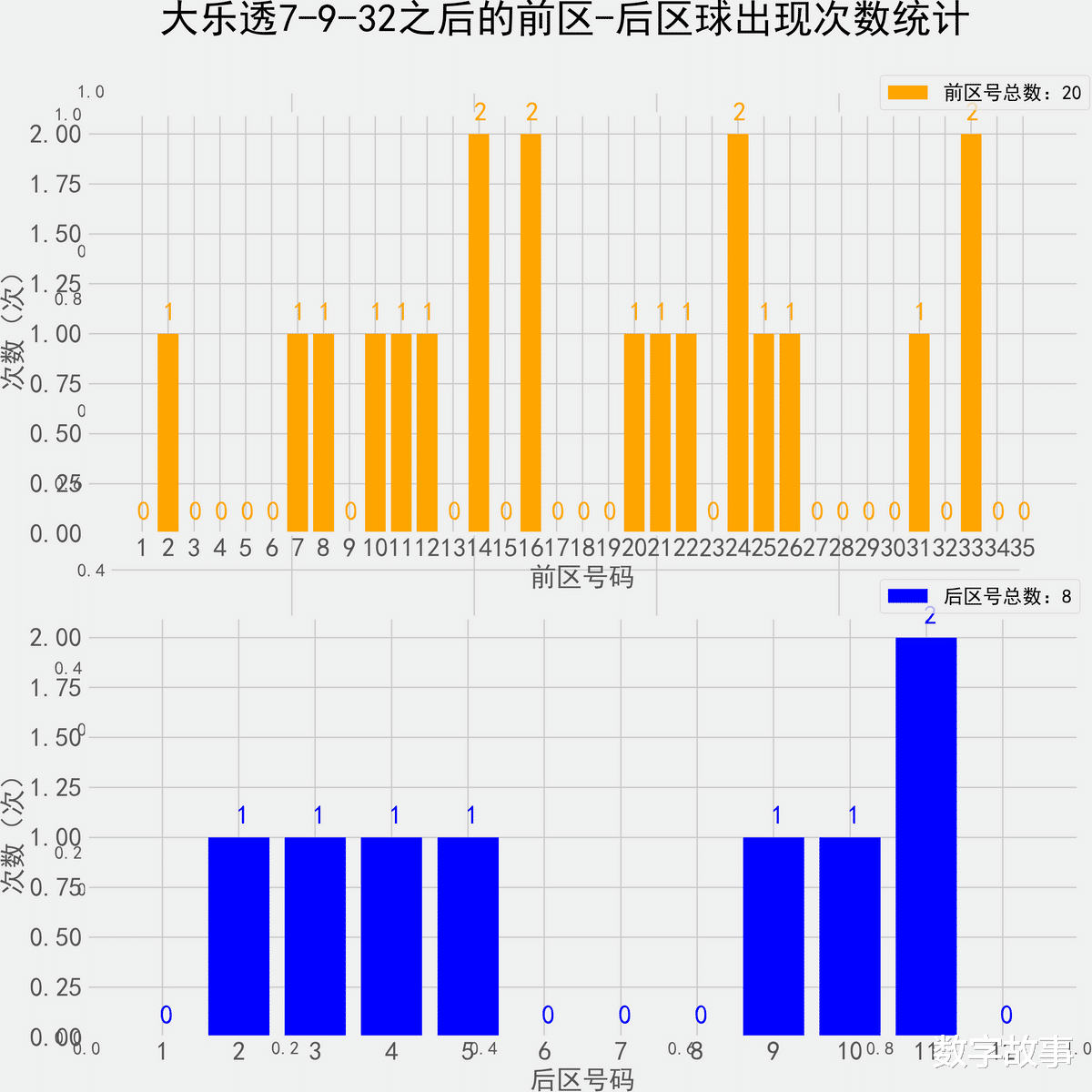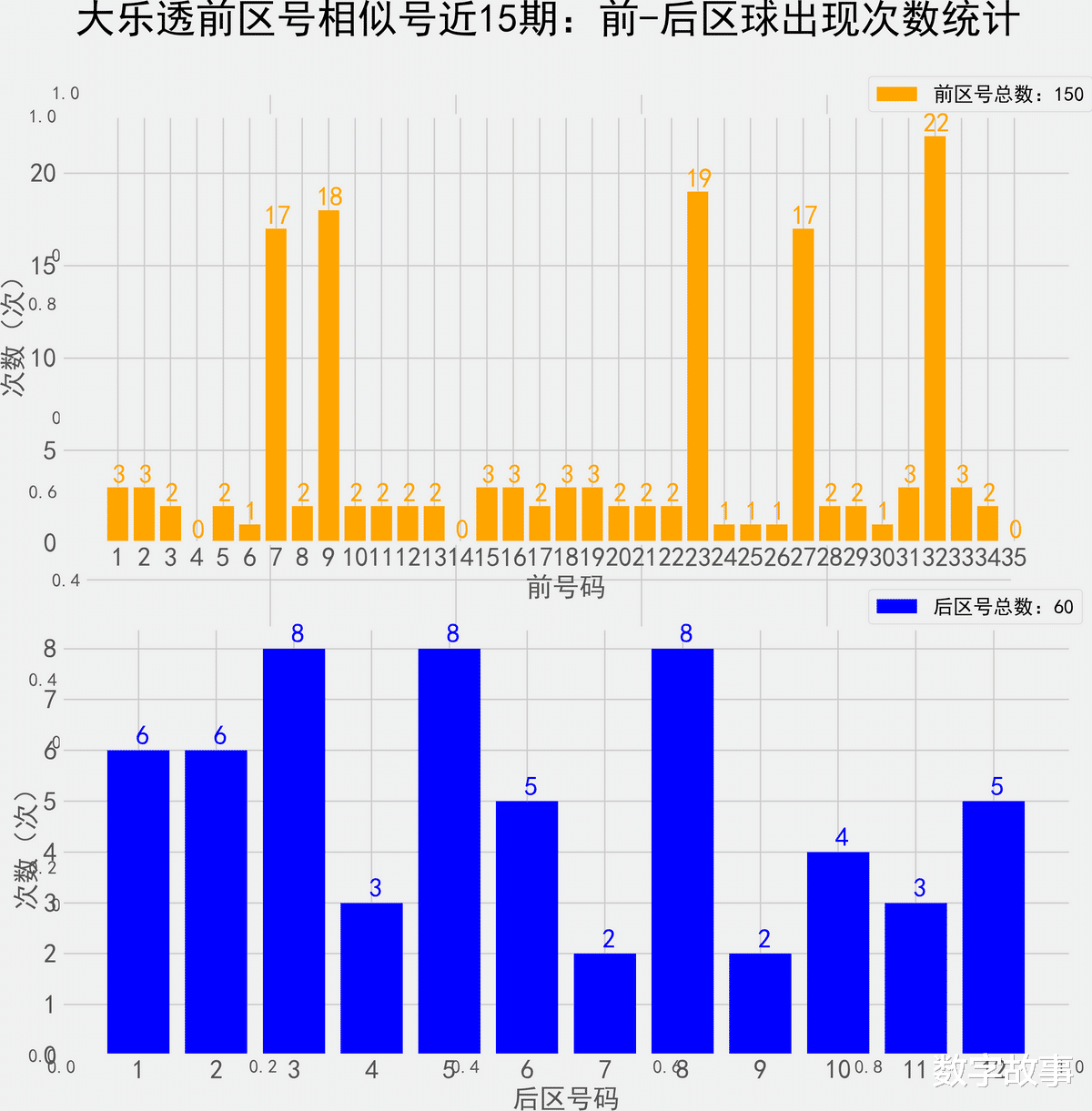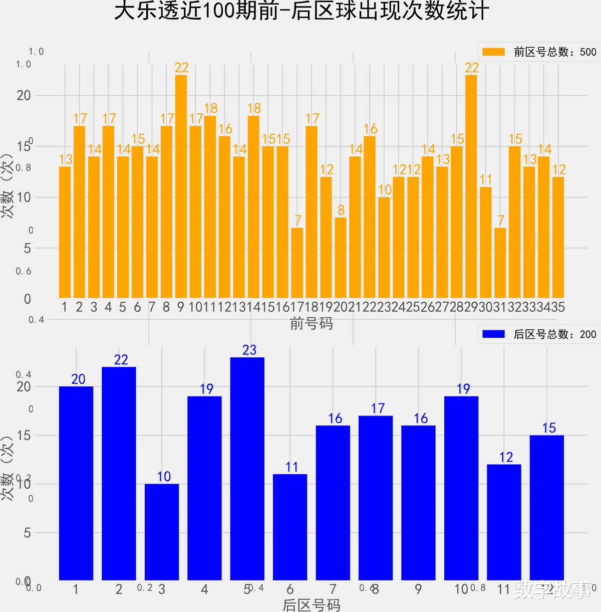 大乐透近100期前后区号统计情况统计样本数据: 500个前区号码 200个后区号码