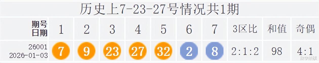 文末有大乐透前区号7-9-32, 7-23-27的历史统计。【体彩大乐透26001期开奖结果及统计】前区号组合历史上有1期四球相同,后区2-8中断10期遗漏;13注一等奖,奖池8.758亿。