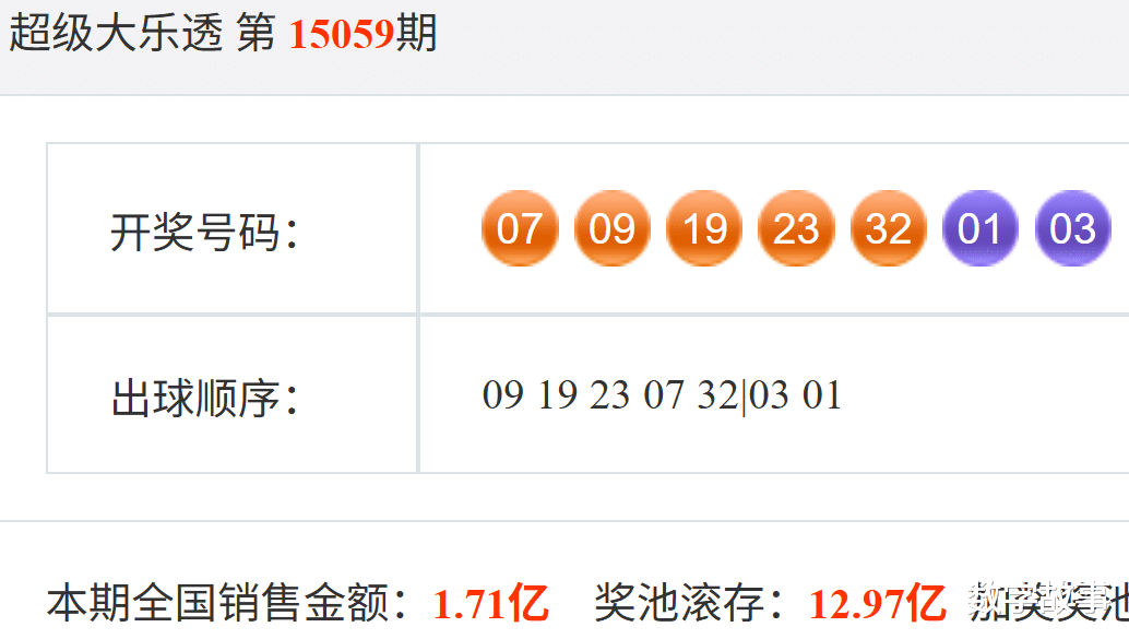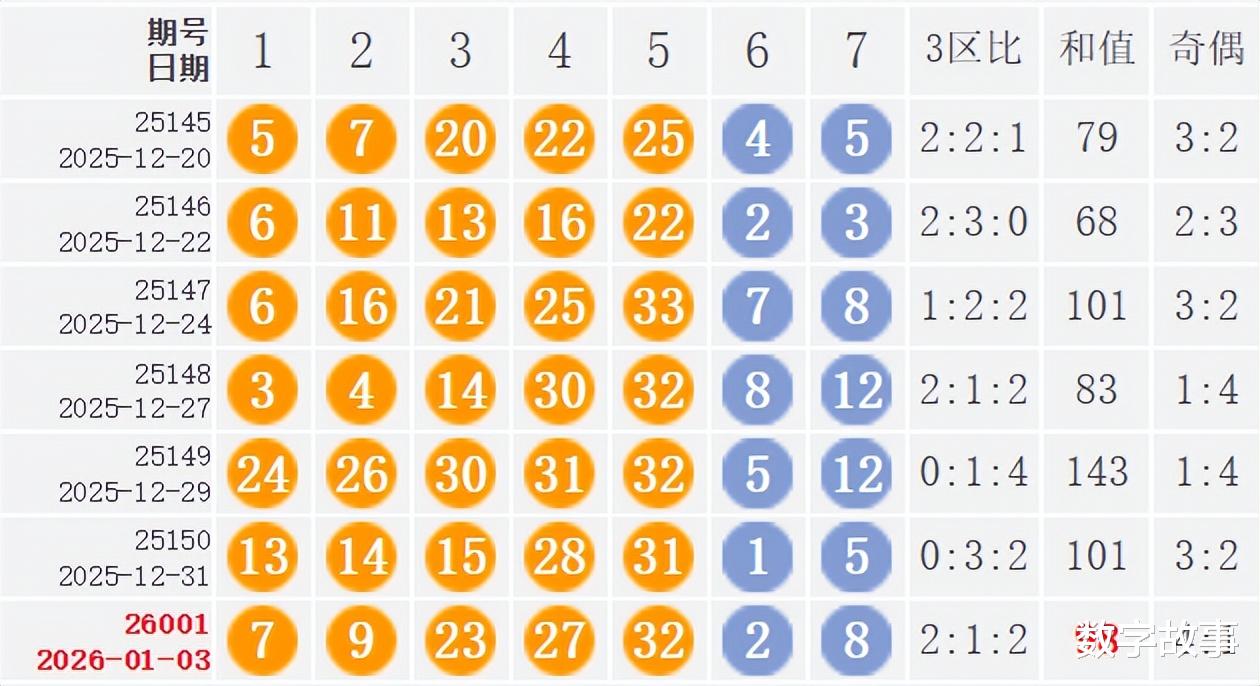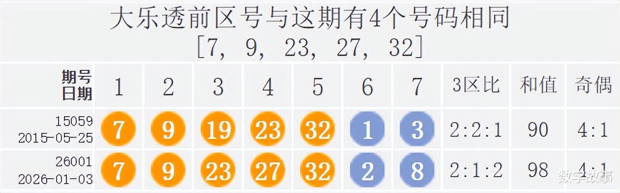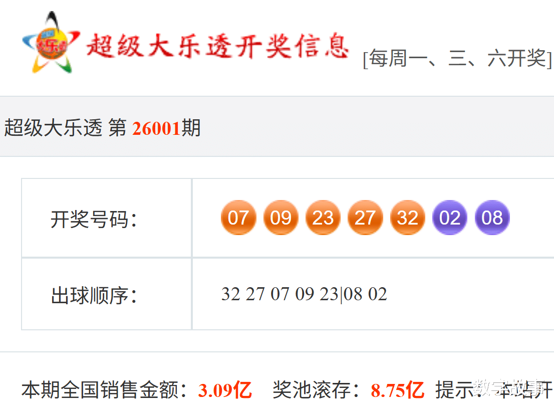 大乐透26001期开奖结果及中奖情况:出奖时间: 2026-01-03 星期六 前区号:7-9-23-27-32后区号:2-8大乐透前区隔期下落:32前区奇偶比:4:1 前区和值:98前区跨度:25 三区比:2:1:2没有连号