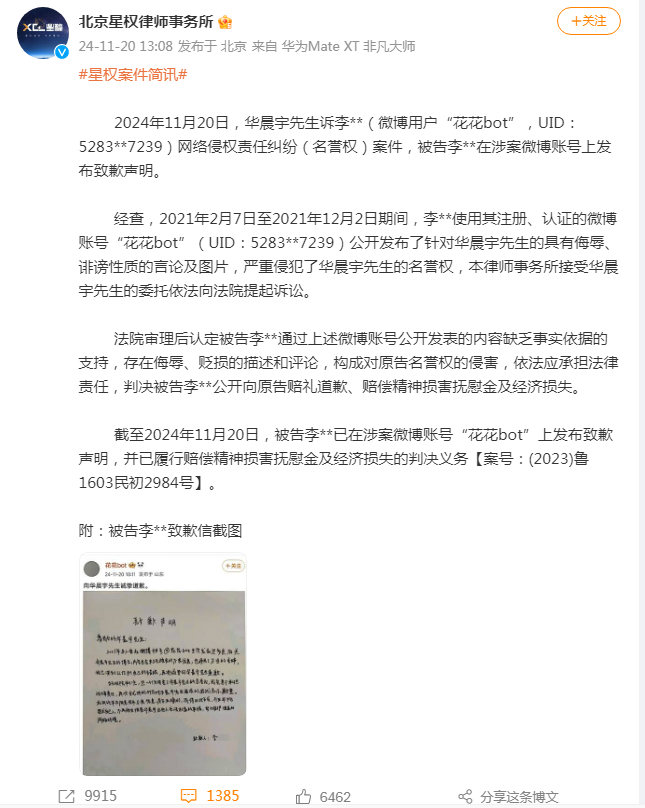 🎉🎉🎉好消息传来!华晨宇维权之战取得了辉煌的胜利!面对网络上的无端指责与恶意攻击,华晨宇工作室毅然决然地拿起法律武器,坚决捍卫华晨宇先生的合法权益!💪💪💪