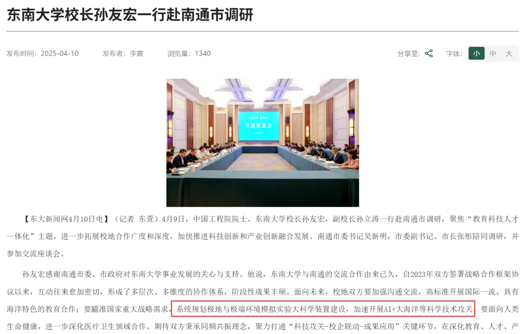 再加上第三重逻辑,海洋,东南大学这两年在大海洋方面比较厉害, 2025年校长孙友宏去南通调研的时候清楚提了极地与极端环境模拟实验大科学装置的规划,还提出要做AI加上海洋的技术攻关,这些方向需要什么, 需要出海口,需要海岸线,需要一个离海足够近的实验场。