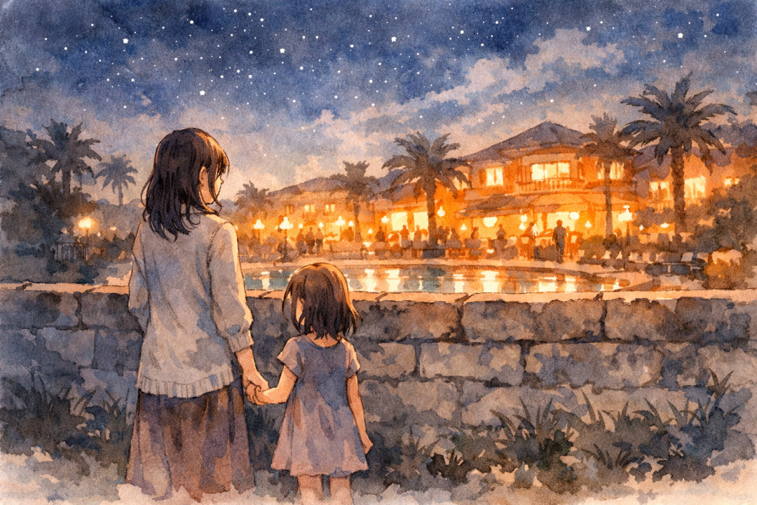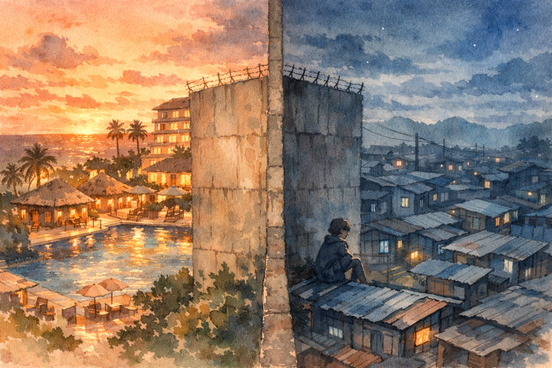 昨天傍晚,玛丽亚下班之后站在度假村围墙外面, 看着里面亮堂堂的建筑,里面传来音乐声,客人们在开派对,她转身往员工村走,那儿没亮光,就只能在黑夜里隐约看见铁皮屋顶。
