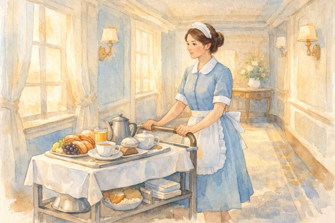 玛丽亚每天早上七点准会来敲门,推着餐车送来早餐,她穿着熨得平整的制服, 笑着说早安,接着就静静走掉了。