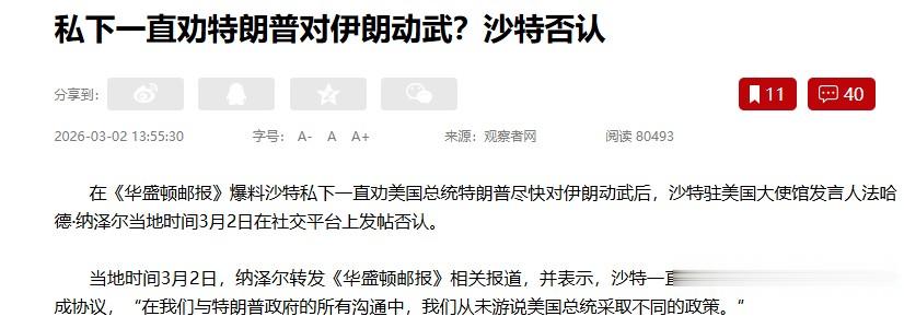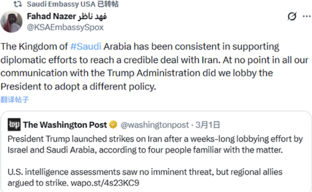 在社交平台上,他写道:沙特一直支持通过外交努力与伊朗达成协议,在我们与特朗普政府的所有沟通中,我们从未游说美国总统采取不同的政策。