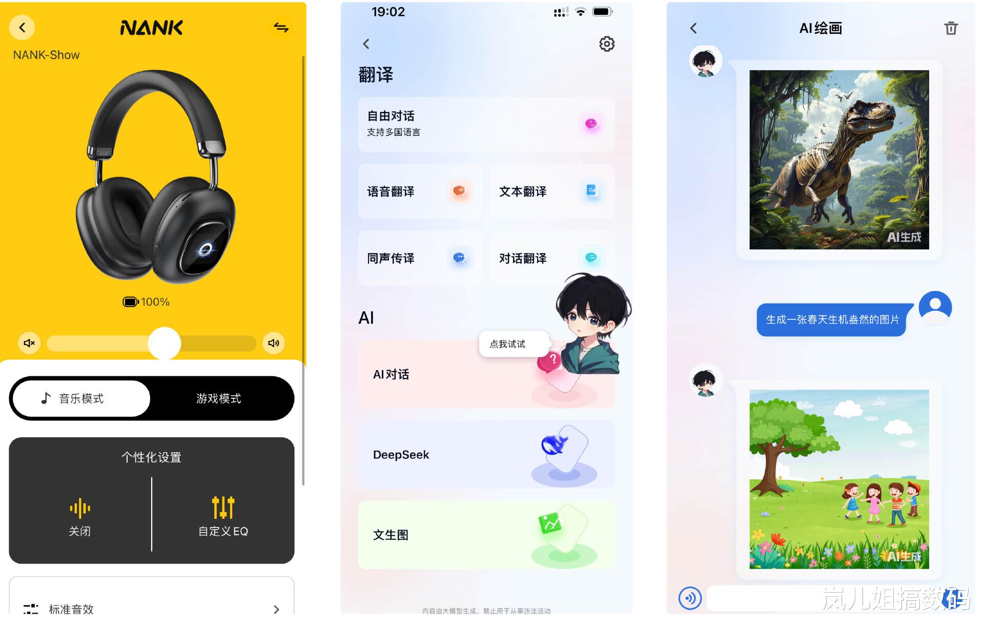 在app端还可以体验多种AI互动体验,耳机集合讯飞xDeepSeek全模加持,可以实现多模态AI能力全面整合,覆盖翻译、对话、助手、内容创作场景,支持全球32种语言,做到边说边译,可以一句话全搞定天气、导航、日程、百科、聊天对话、AI生成图片,能做到秒速响应,比手机更快,如果创作缺少灵感,还能帮你会写、会画、写作等,一秒带来创作灵感,帮你构思文案、梳理思路,提高了工作效率,还成为了离不开的生活小助手,让你的生活不再枯燥乏味。