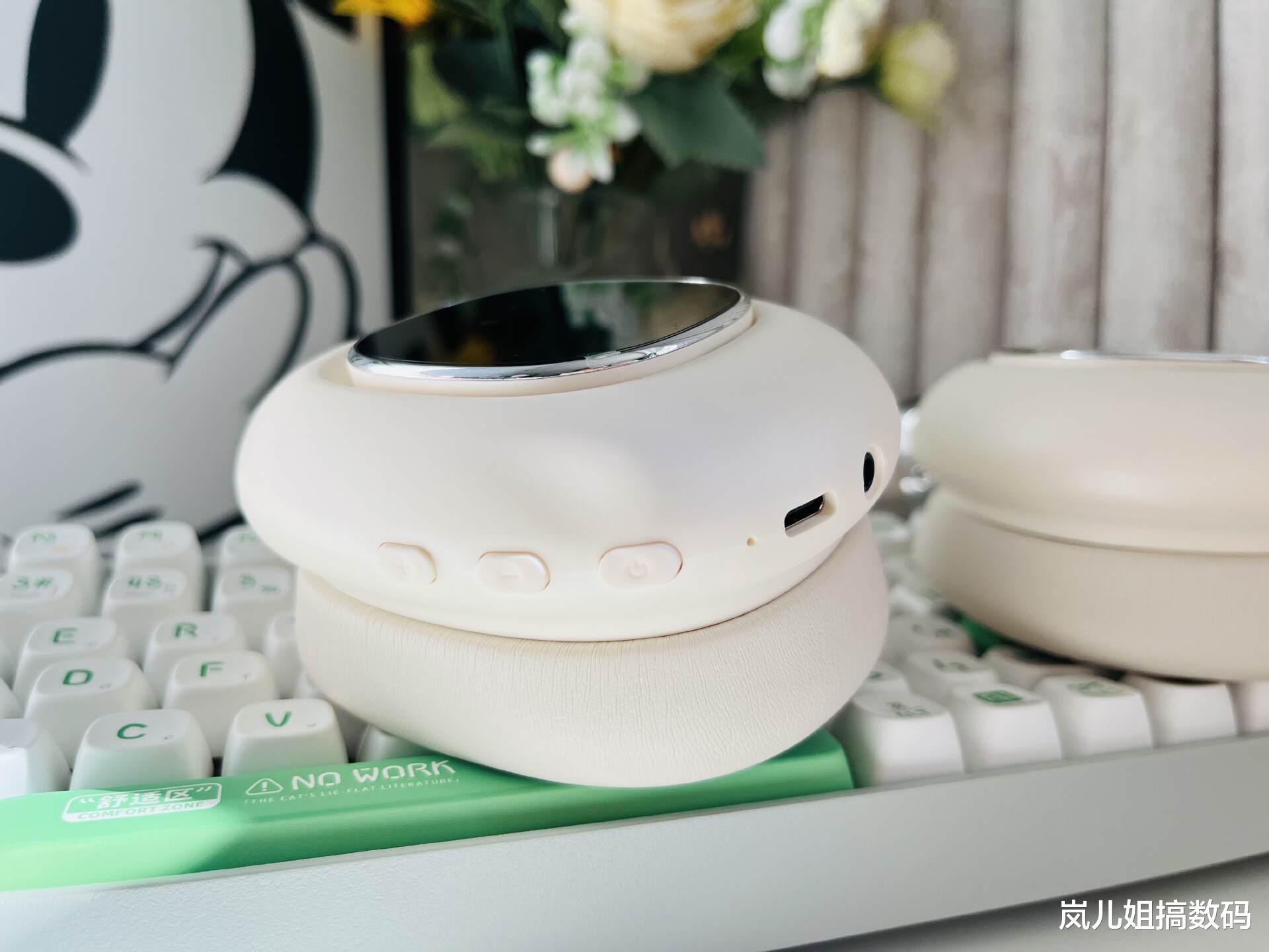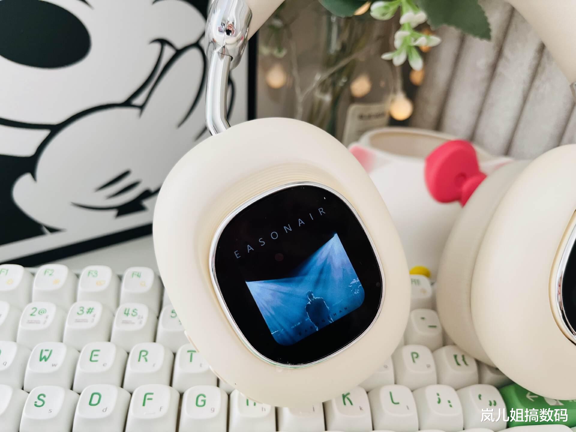 最值得夸一夸的是可拆卸磁吸灵动屏设计,是耳机最吸睛最炫酷的亮点设计,耳罩外侧分别有一块1.3英寸OLED屏,增加了耳机的可玩性,是首款可拆卸智能交互灵动屏,轻轻一对准就可以牢牢吸住。