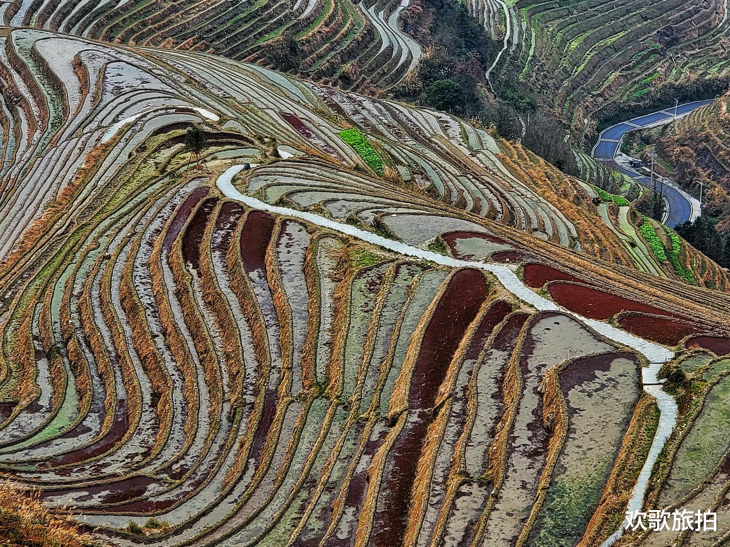 #我的旅行记录 桂林龙脊梯田平安寨,有着"世界梯田之冠"的美誉,踏入平安寨,目光便被层层叠叠的曲线牵引,那是刻在山脊上的世遗画卷,是壮族祖先以山为纸、以锄为笔写下的千年史诗。梯田在海拔300余米盘绕而上,直至800多米的山巅,15000多田块错落有致。收割后的梯田灌满了水,平整如镜,映着流云与青峰,天光云影同一画框。梯田层层叠叠如天梯垂落,站在观景台远眺,九龙五虎气势雄浑,山脊如龙蜿蜒,丘峦似虎蛰伏;七星伴月温婉灵动,七座田心小丘如星拱月,勾勒出天地间最温柔的轮廓。震撼人心的壮观,是壮族祖先肩挑手凿劳动的结晶,一锄一筐开垦荒坡,一石一木垒筑田埂,在陡峭的山脊上雕琢出这片农耕奇迹,让贫瘠山地变成岁岁丰稔的良田。田埂间的石板路被岁月磨得光滑,吊脚楼依山而建,炊烟与云雾交织,我站在这片大地的指纹之上,震撼从眼底直达心里,这种视觉的盛宴,让每一个游者,都读懂山河与人心的力量,读懂生生不息的千年农耕文明。手机随手拍原创图文,感谢分享转发,记得点赞。