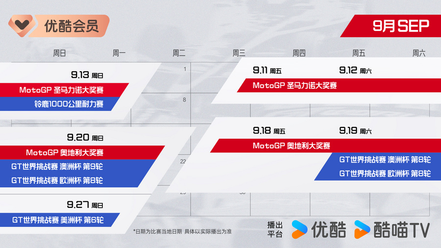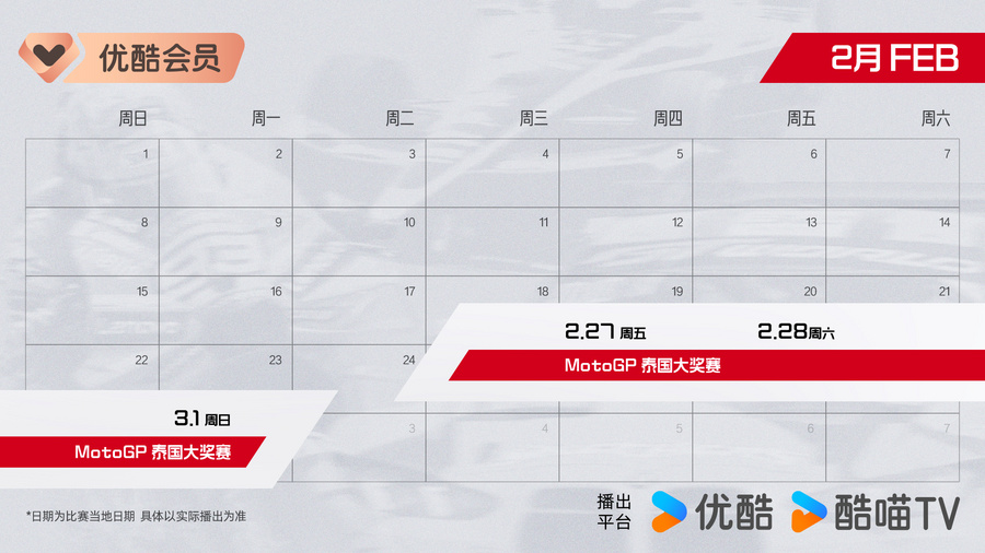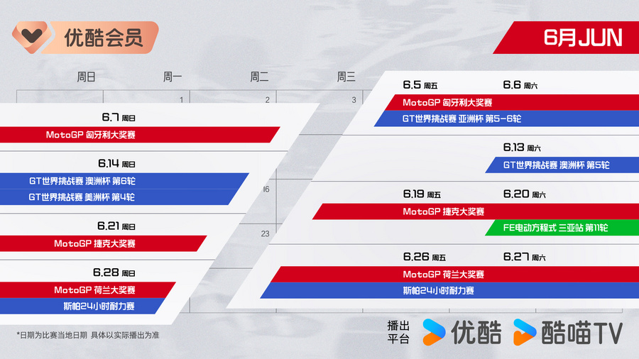 2026年,赛车盛宴轰鸣启幕!优酷体育携三大赛事重磅来袭:3月20日,MotoGP巴西大奖赛;3月21日,FE电动方程式马德里站;3月28日,GT世界挑战赛澳洲杯第一轮。专属“赛车观赛日历”同步上线,邀您锁定优酷体育,见证赛道上的速度对决、科技突破与热血坚守,让每一份热爱,都在引擎轰鸣中尽情释放!