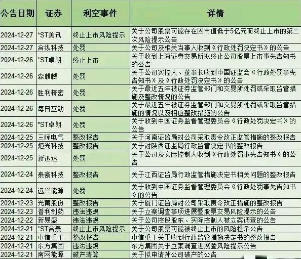 监管处罚方面,近期有8家公司受到了监管机构的处罚。如ST博信因未按规定履行信息披露义务,被出具提醒函;凯因科技因信披违规被通报批评;冰山冷热因未按规定披露诉讼信息,也被出具提醒函等。这些公司的违规行为不仅损害了投资者的利益,破坏了市场的公平秩序,还会引发市场对整个行业监管环境的担忧。受到处罚的公司,其股价往往会出现大幅下跌,公司的声誉和形象也会受到严重的损害,后续的融资和经营活动可能会面临诸多困难。监管部门对违规行为的严厉打击,旨在维护市场的正常秩序,保护投资者的合法权益。投资者在选择投资标的时,应尽量避开那些存在违规行为的公司,同时要关注公司的合规运营情况,避免潜在的风险。