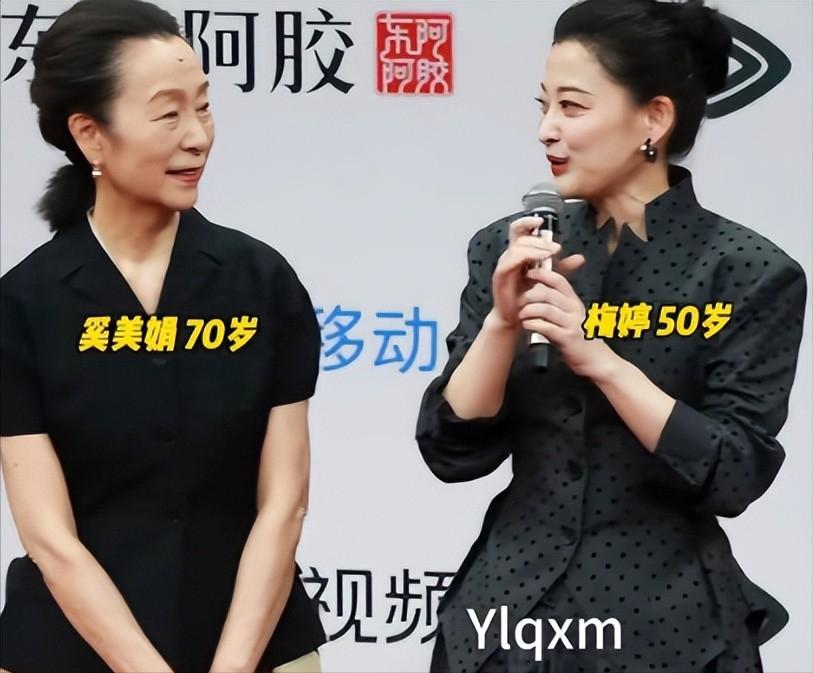 那种朴素到近乎想要隐身的装束,和她必须站在聚光灯下的C位身份形成了极其刺眼的错位。在与梅婷同框接受采访时,这种对比被拉大到了极致:一边是梅婷大大方方、谈笑风生的自信。