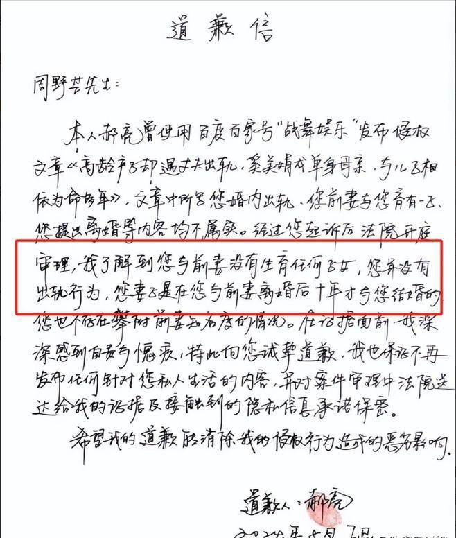 这封信的内容本身并没有多复杂,是一个造谣者迫于律师函的压力不得不出来澄清事实。但就是这短短的文字,揭开了一段被尘封多年的真相:那个关于周野芒“抛妻弃子”的故事,原来彻头彻尾都是一场公众被误导后的集体狂欢。