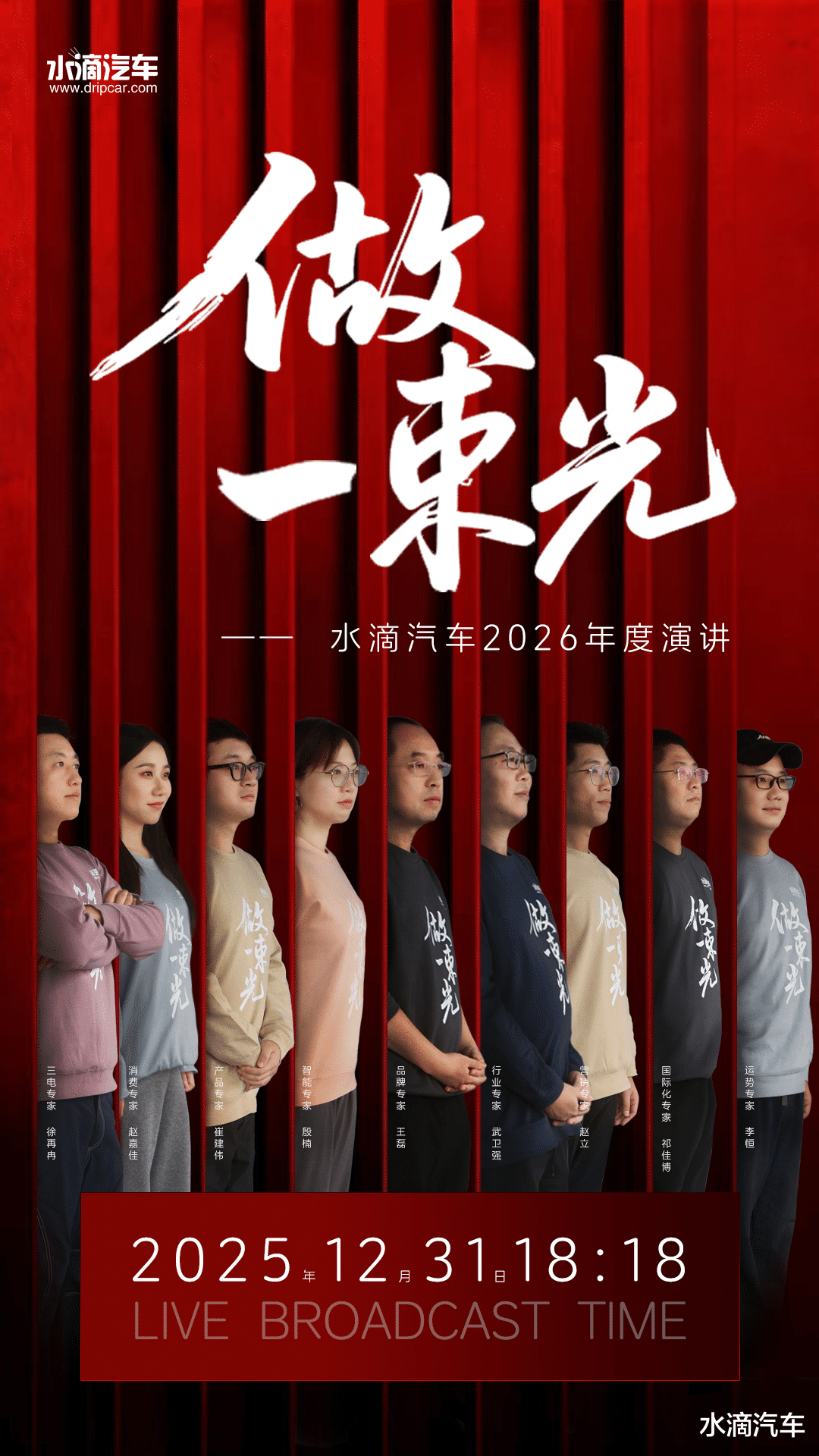 本次年度榜单的核心内容,将贯穿于12月31日18:18开始的水滴汽车2026年度演讲《做一束光》之中,更多行业洞察与未来展望,敬请期待!